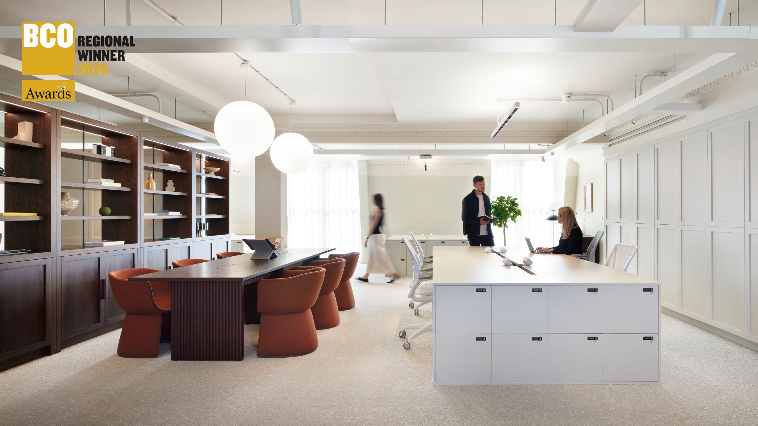 Mid-century-inflected workspace in Canary Wharf