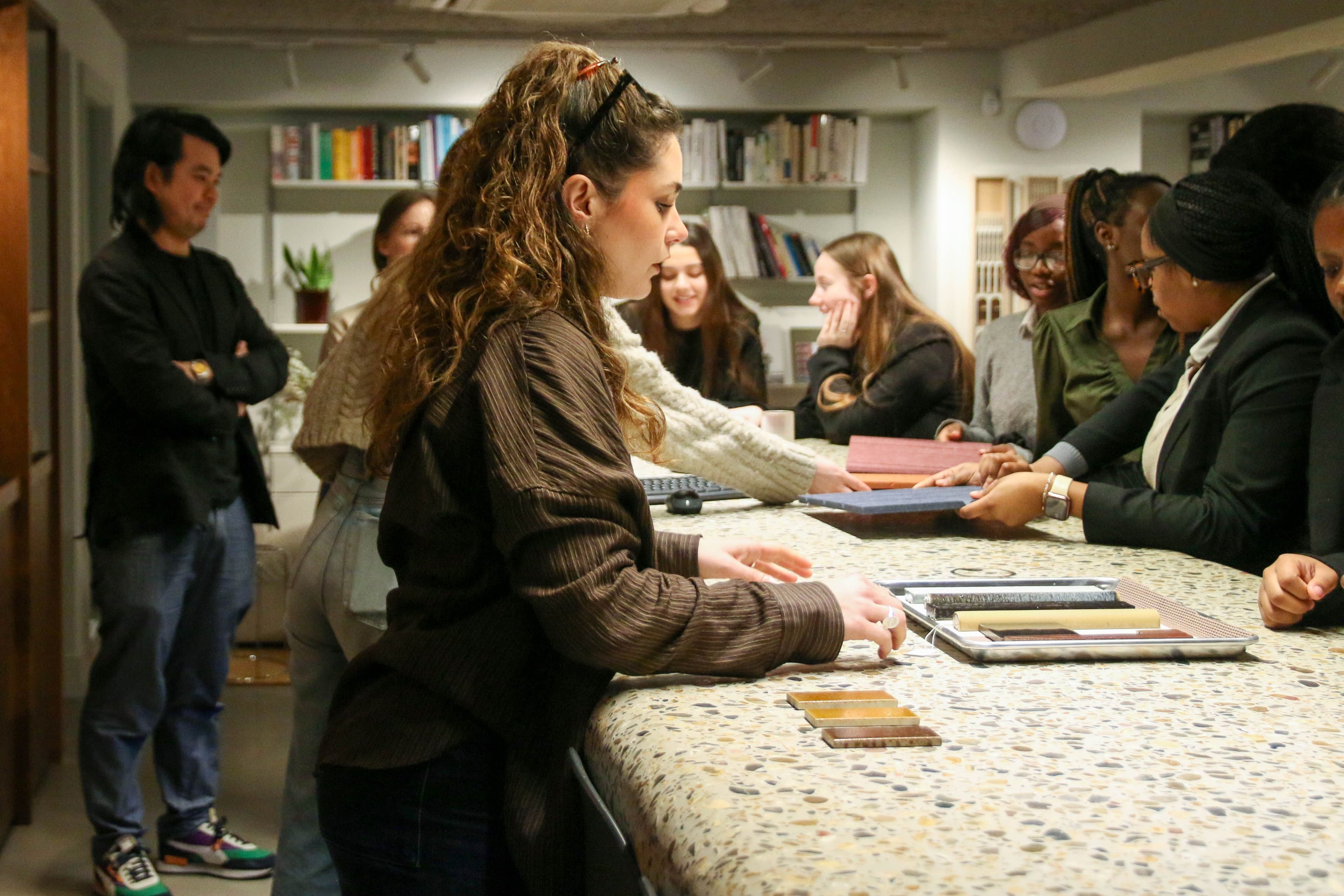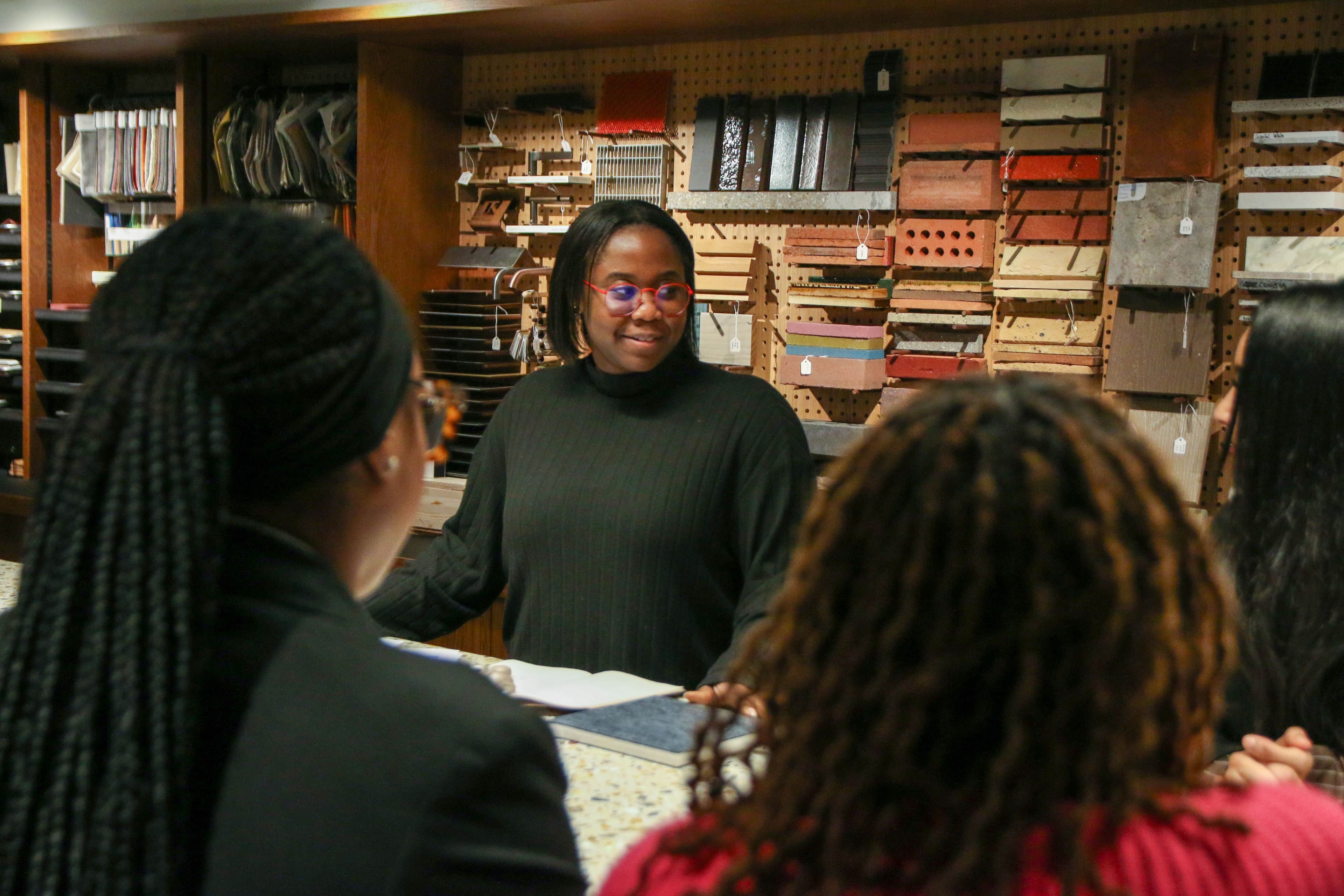 The group heard from our team about different routes into architecture and design, explored our sample library – learning how everyday waste such as coffee cups and plastic bottles can be transformed into building materials – and completed a design exercise based on a real dMFK nursery project.