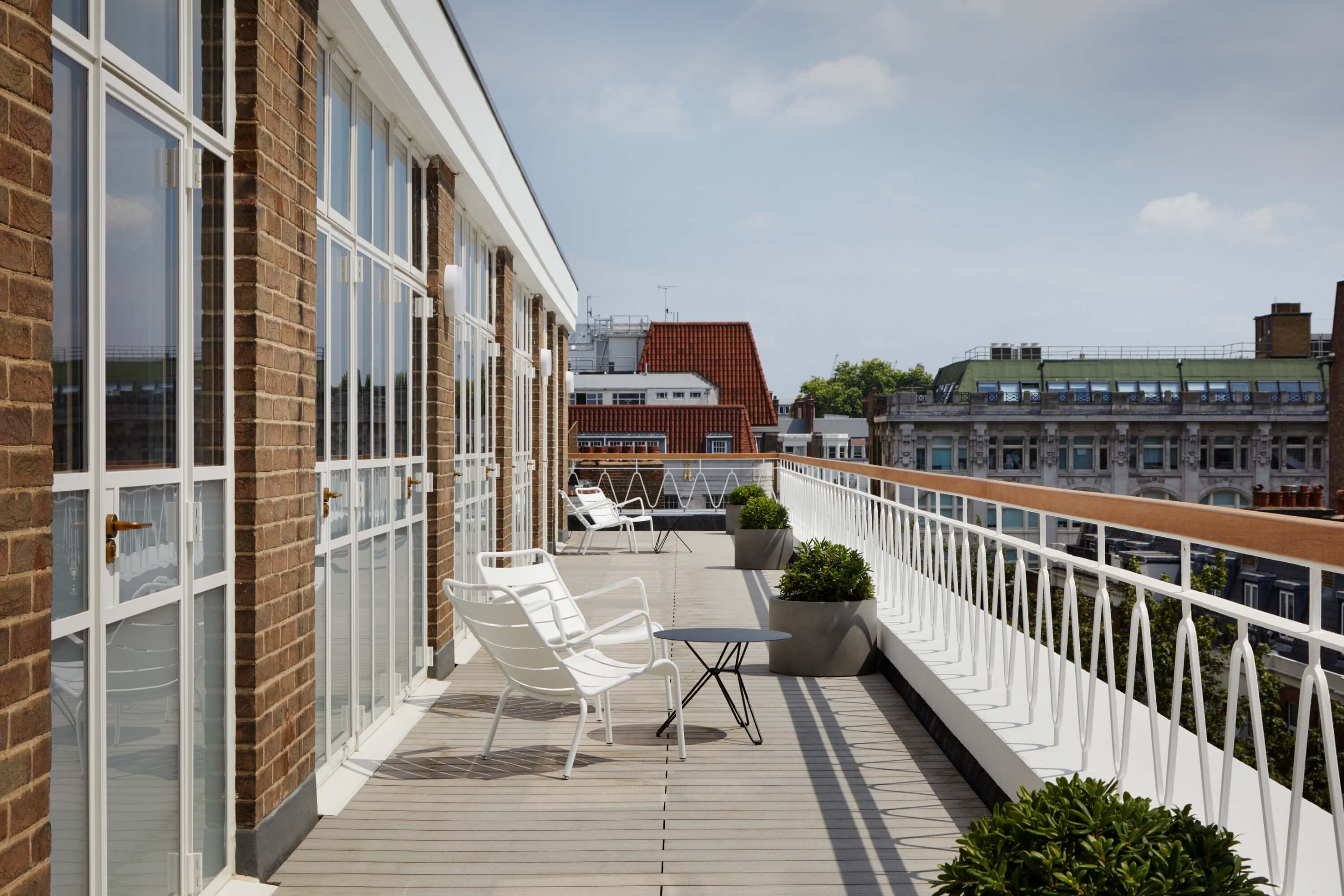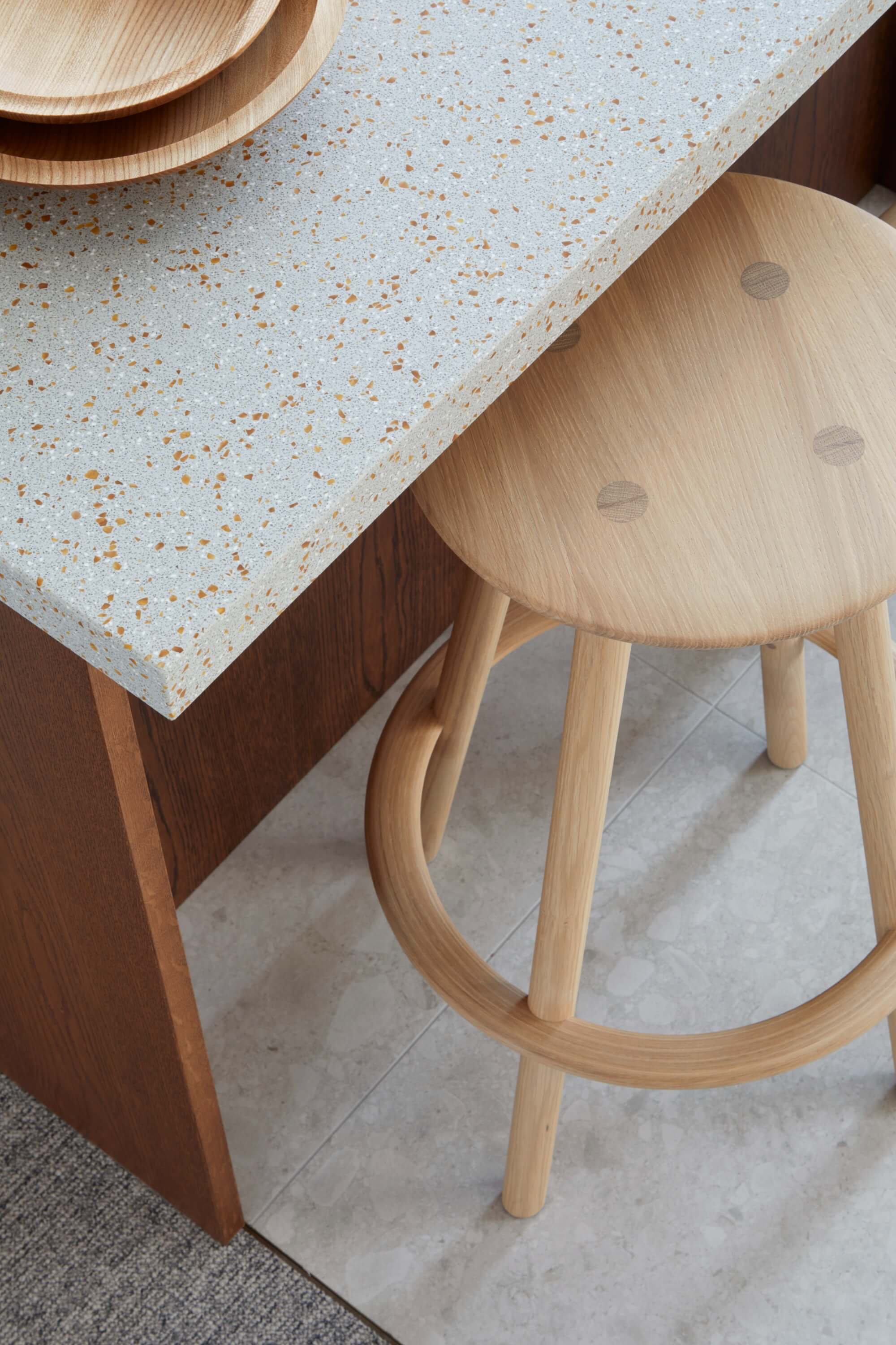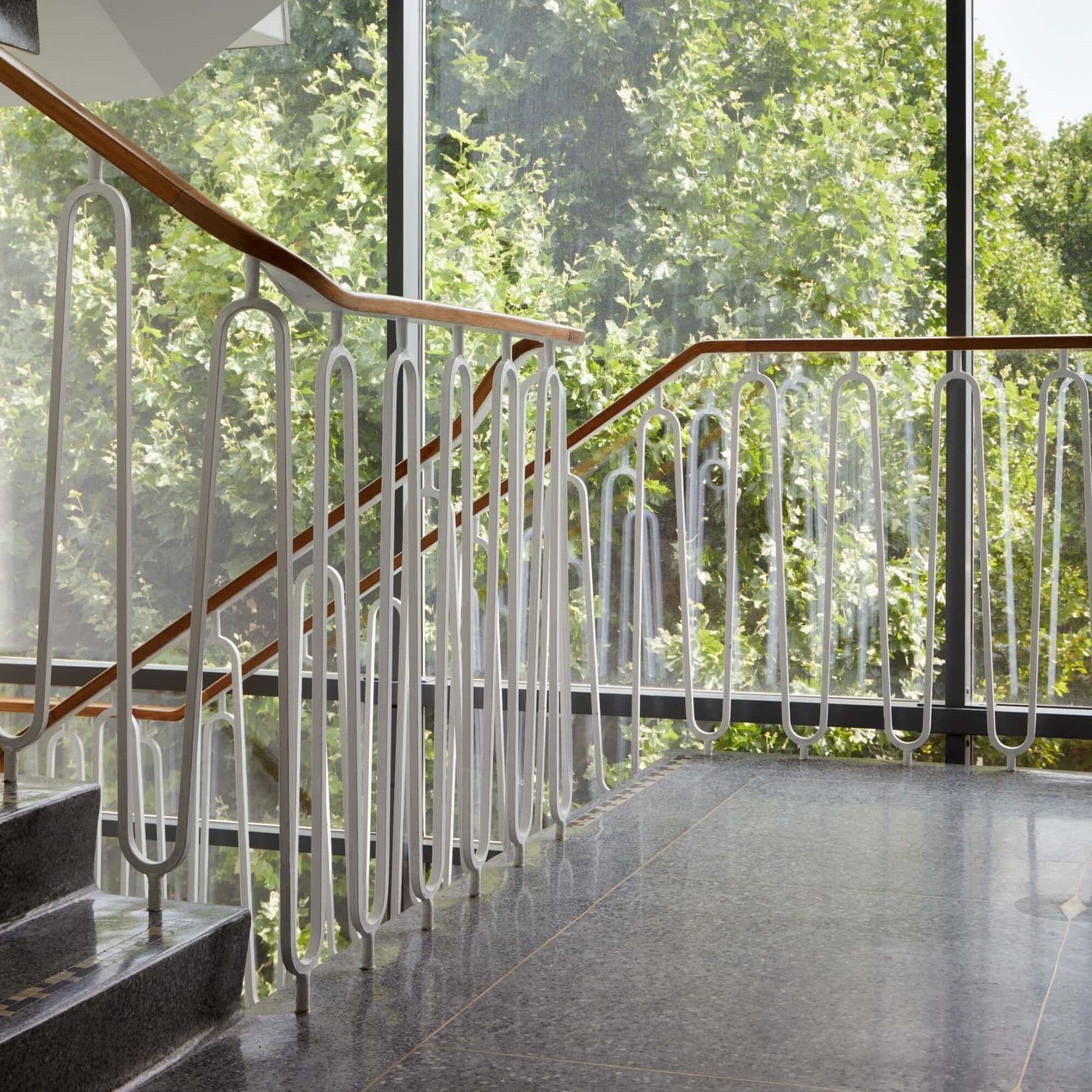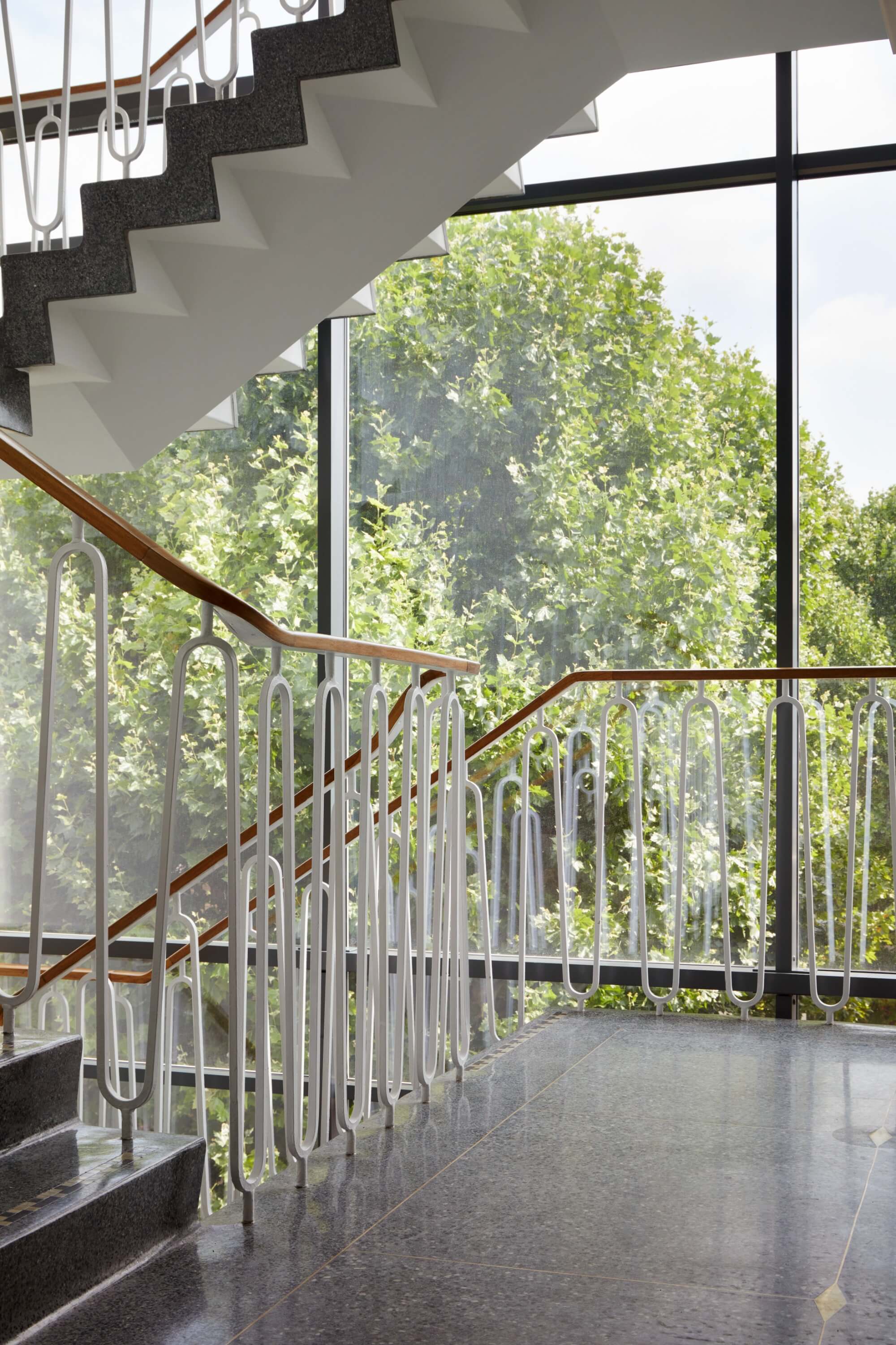 We began by understanding what could be retained and reused. Existing services were refurbished where possible, and finishes were repaired rather than stripped away. New insertions were purposeful and restrained. Subtle nods to the building’s past appear in details such as the custom upholstery, which references the shapes of the terrace’s original balustrade, now restored and refinished. A simple palette of timber, resin and metal complements the structure without competing with it.