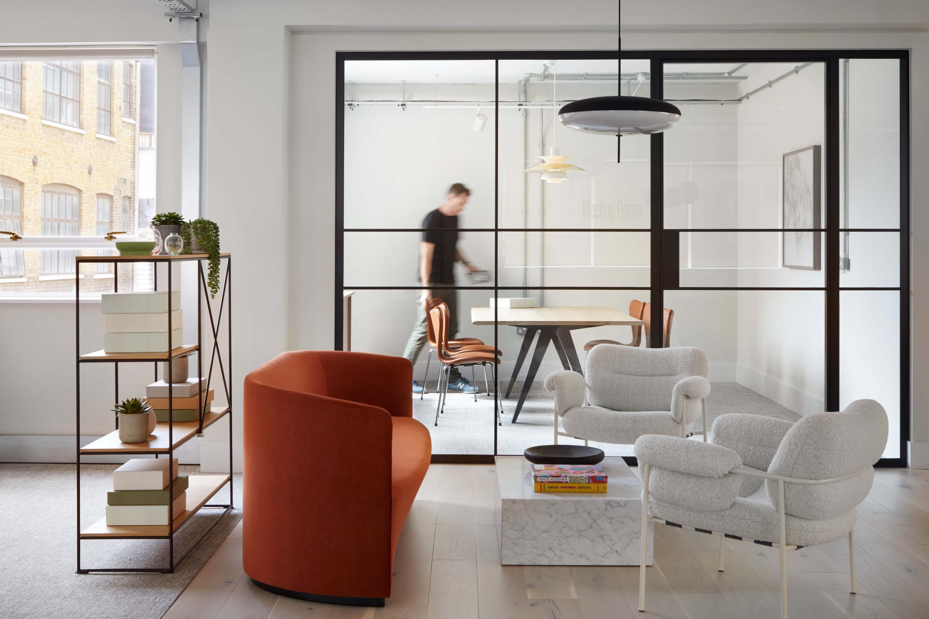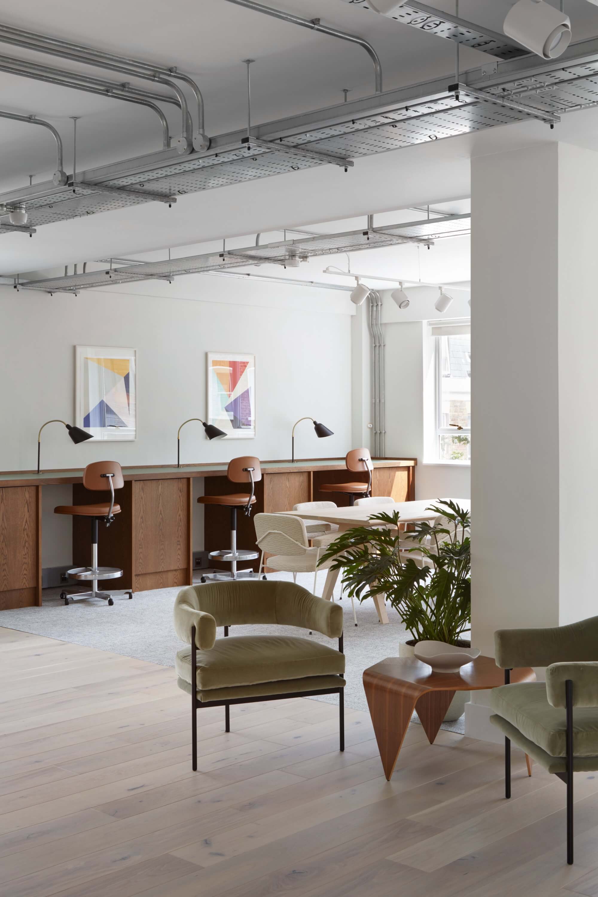 43 Whitfield Street feels calm and bright. The new workspace offers the kind of zoning variety you might find in a coworking environment, all within a single tenant’s demise. Located in bustling Fitzrovia, the project comprises 1,700 sqm over four floors, and each floor is triple aspect, flooding the offices with natural light. Materials are warm and durable, with bespoke upholstery and crafted joinery anchoring the interiors. It is a space designed to be welcoming and easy to use.