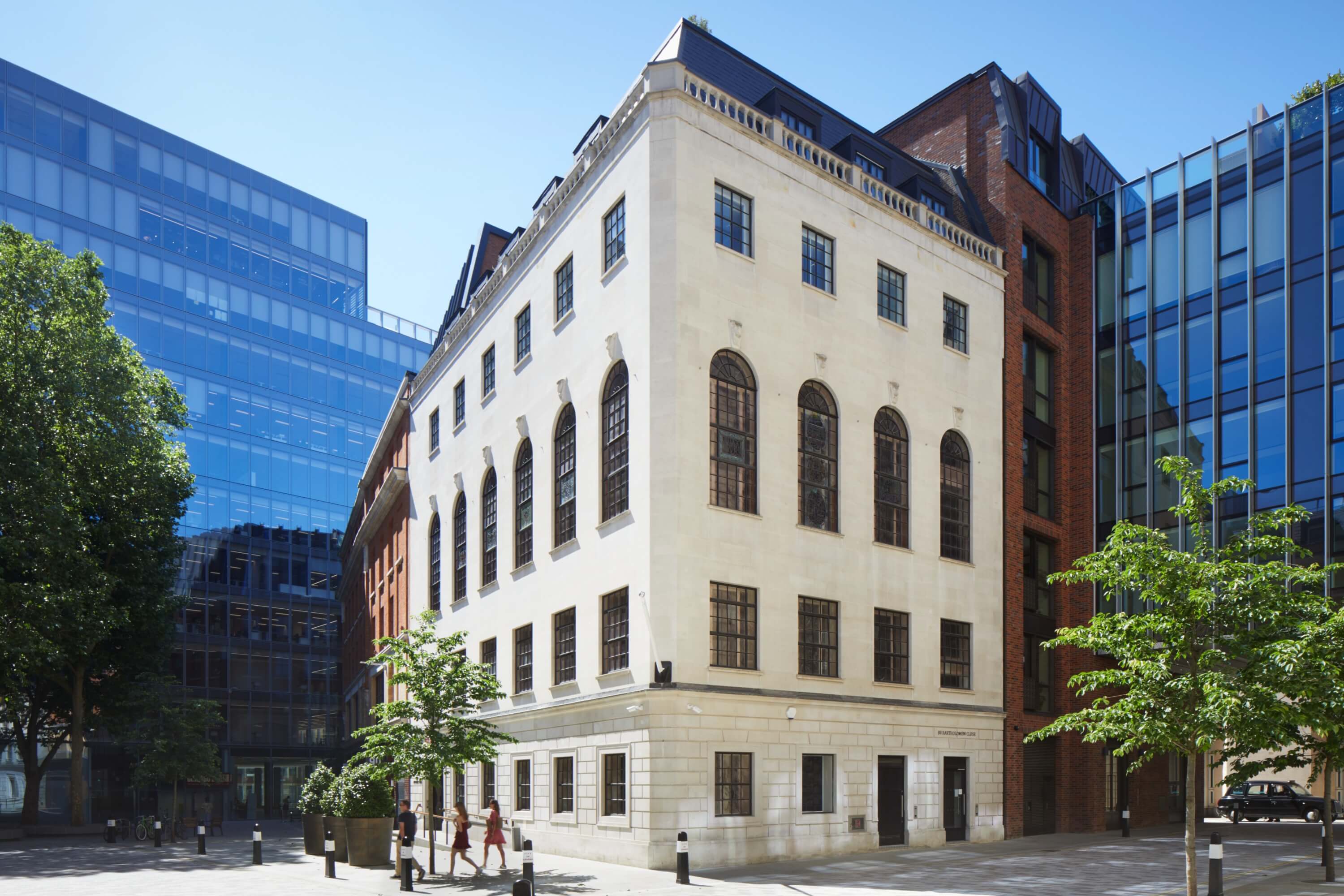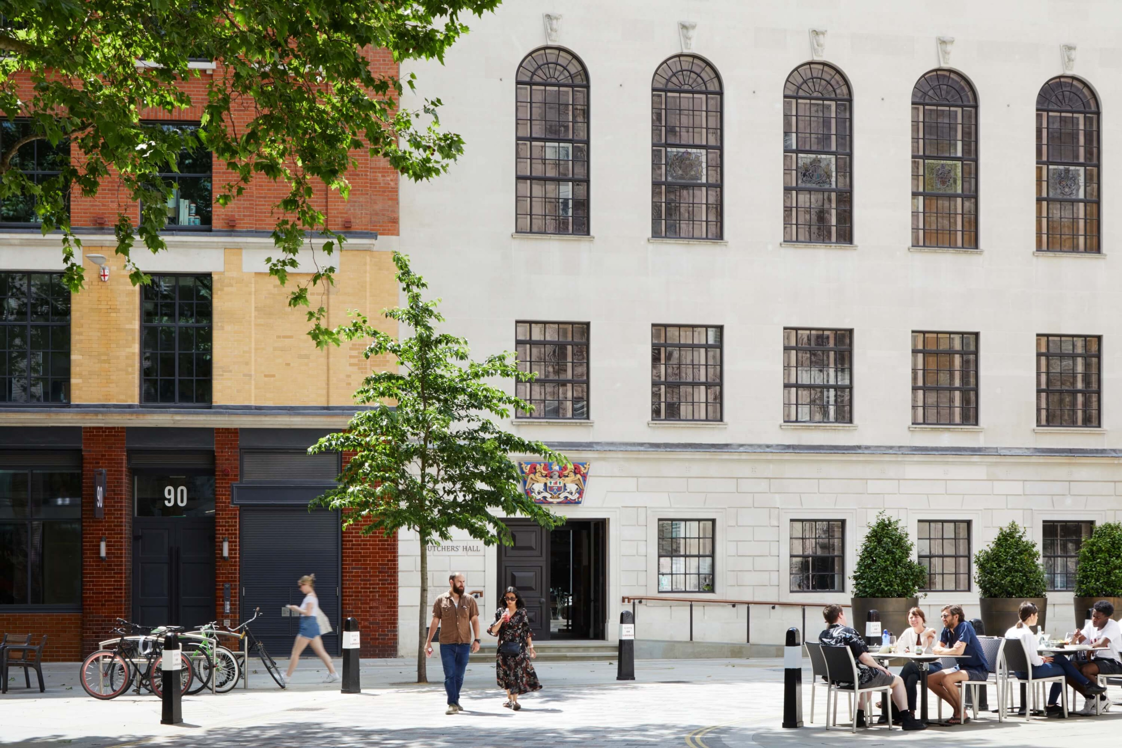 Butchers’ Hall feels ceremonial and warm. Restored timber panelling, terrazzo underfoot and balanced lighting shape a generous sense of arrival. The Great Hall becomes an elegant setting for dining, weddings and gathering, supported by courtrooms and function rooms reshaped for contemporary use. Above, new offices look out over Smithfield’s market rooftops, while a planted roof garden offers rare city calm. Behind the scenes, discreet upgrades make the building work harder – efficient, accessible and ready for the years ahead.