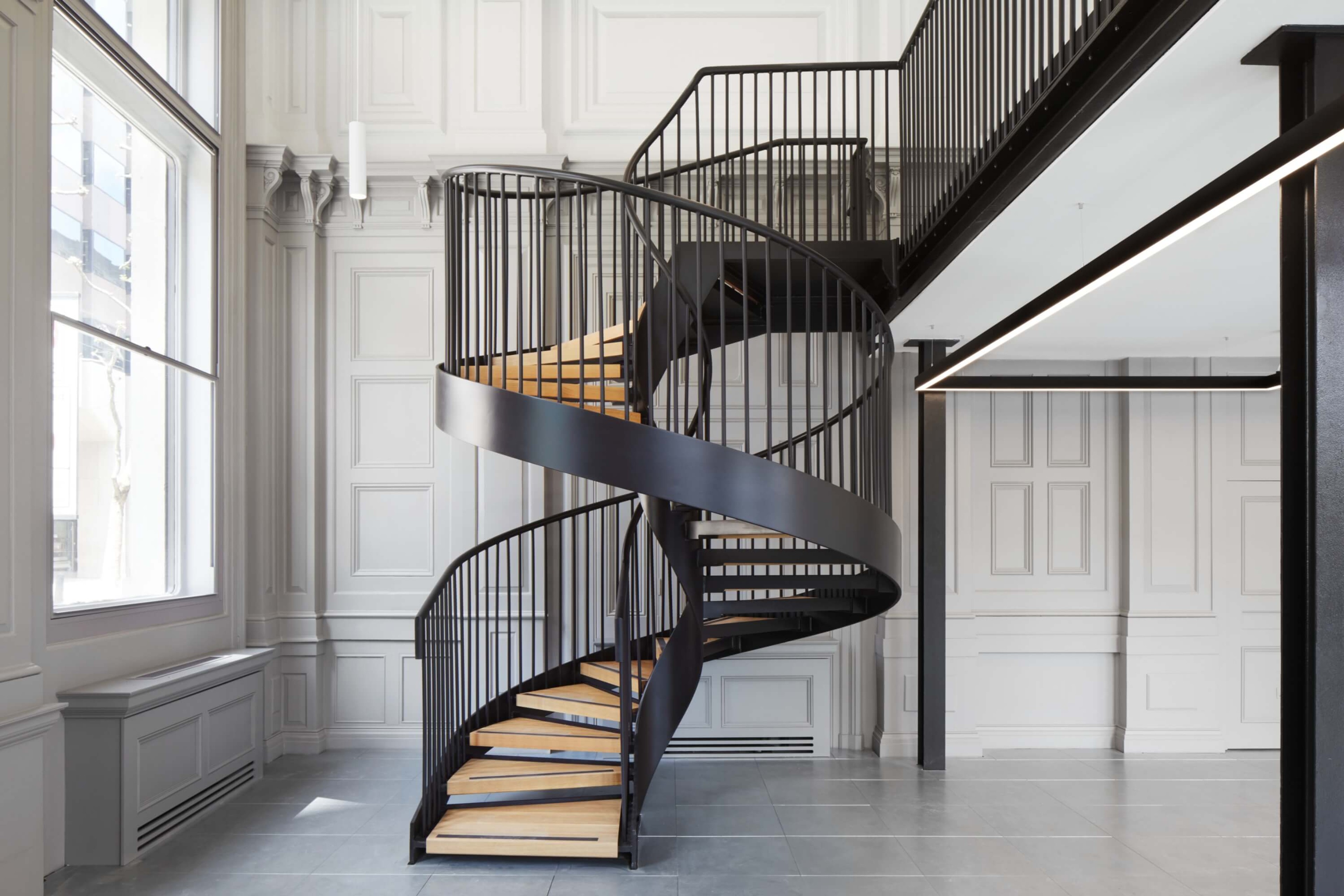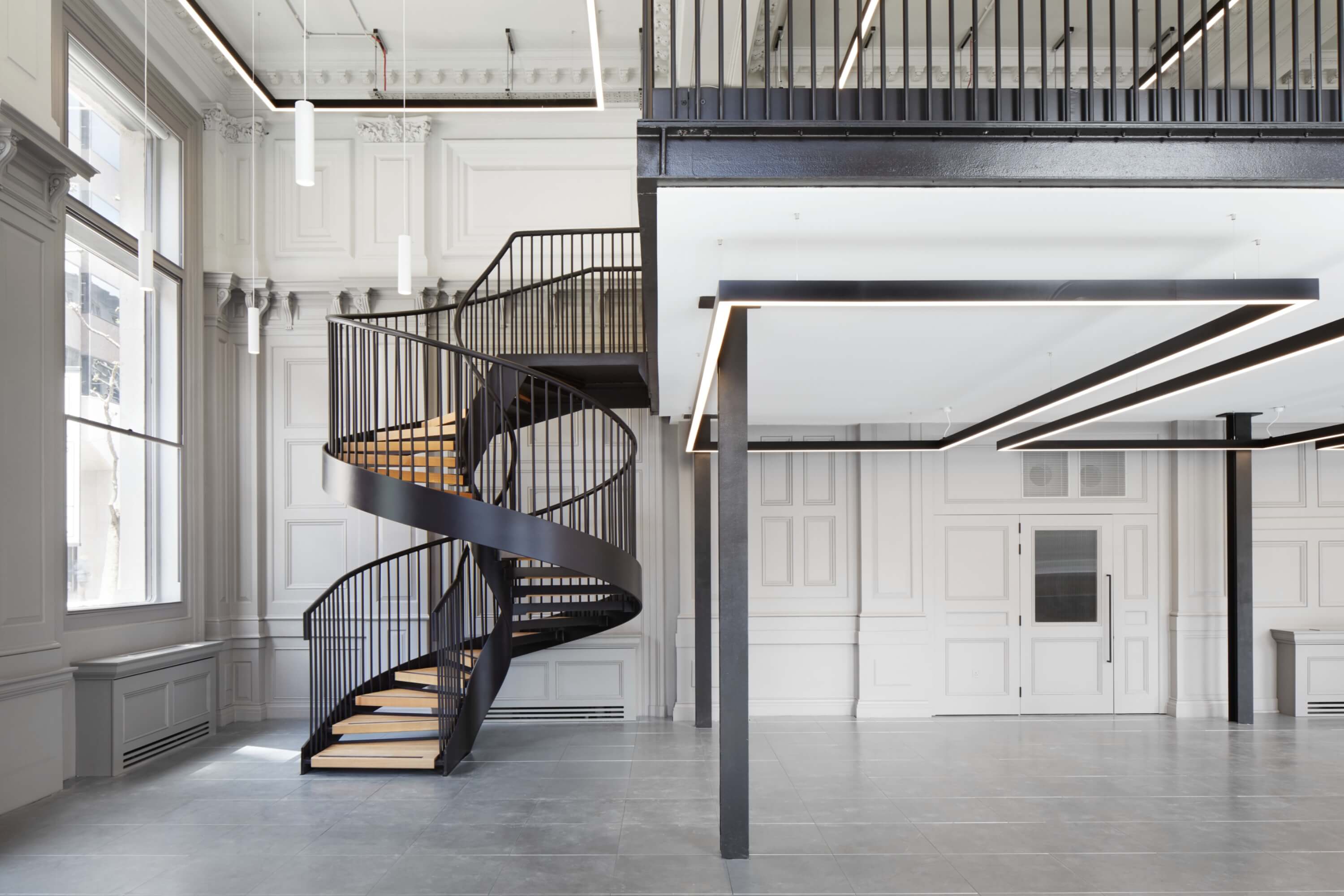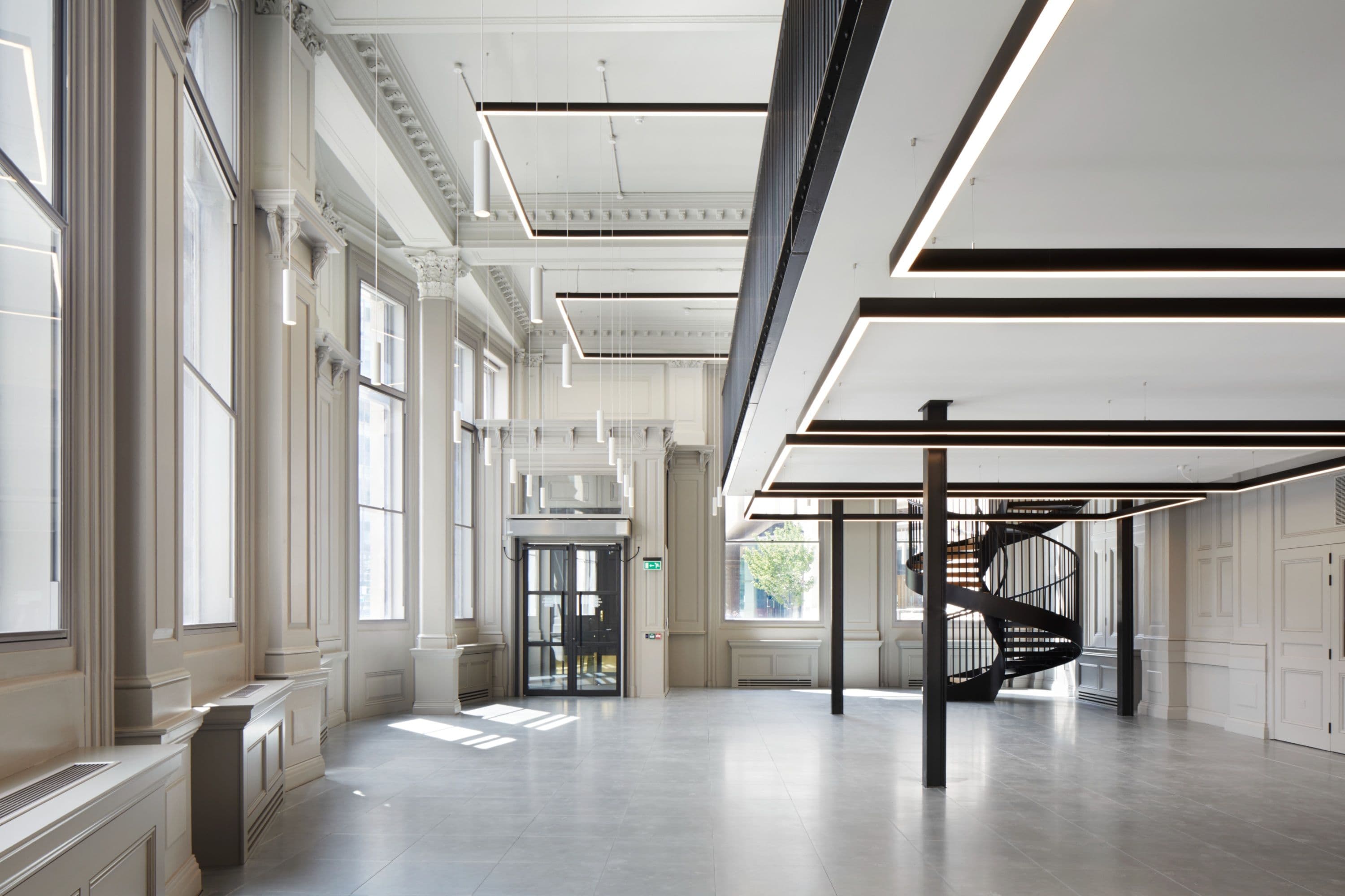 At ground level, the double-height banking hall is carefully reworked around a sculptural helical staircase, which introduces a clear sense of arrival and connects to a new mezzanine level without compromising the hall’s original proportions. Below, the conversion of the former vaults into showers and cycle storage ensures the building supports contemporary patterns of use, allowing its historic fabric to work hard for modern working life.
