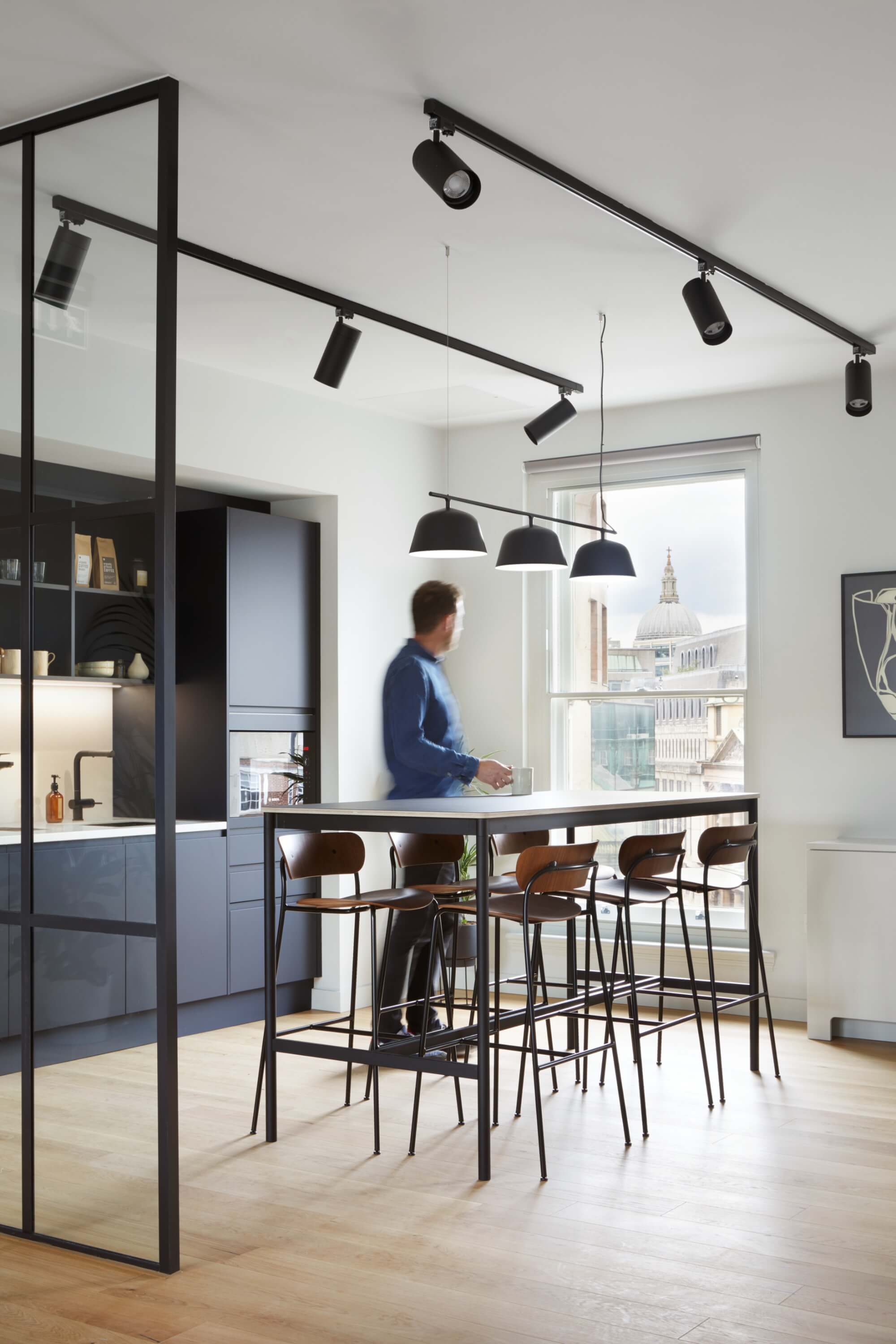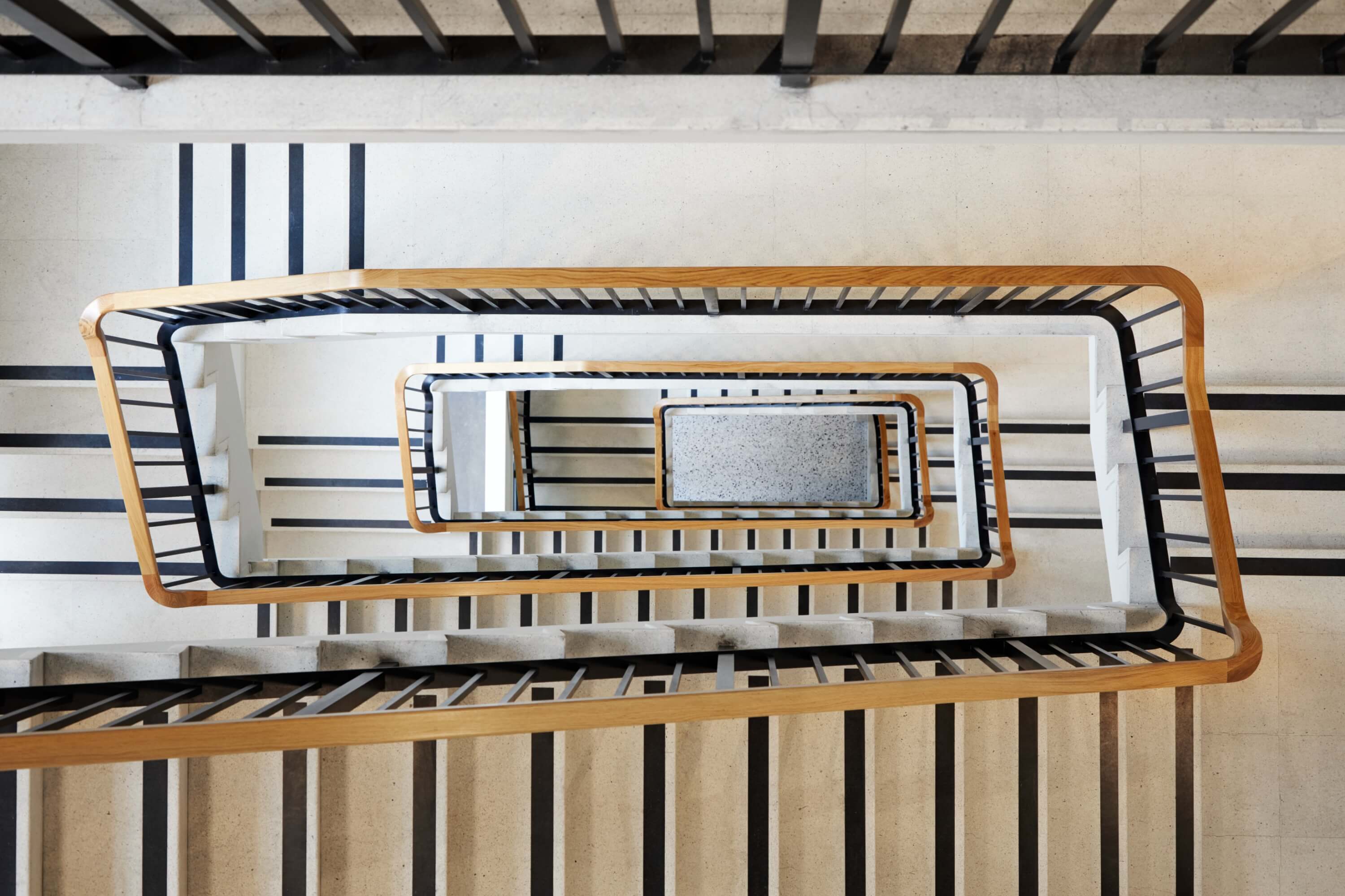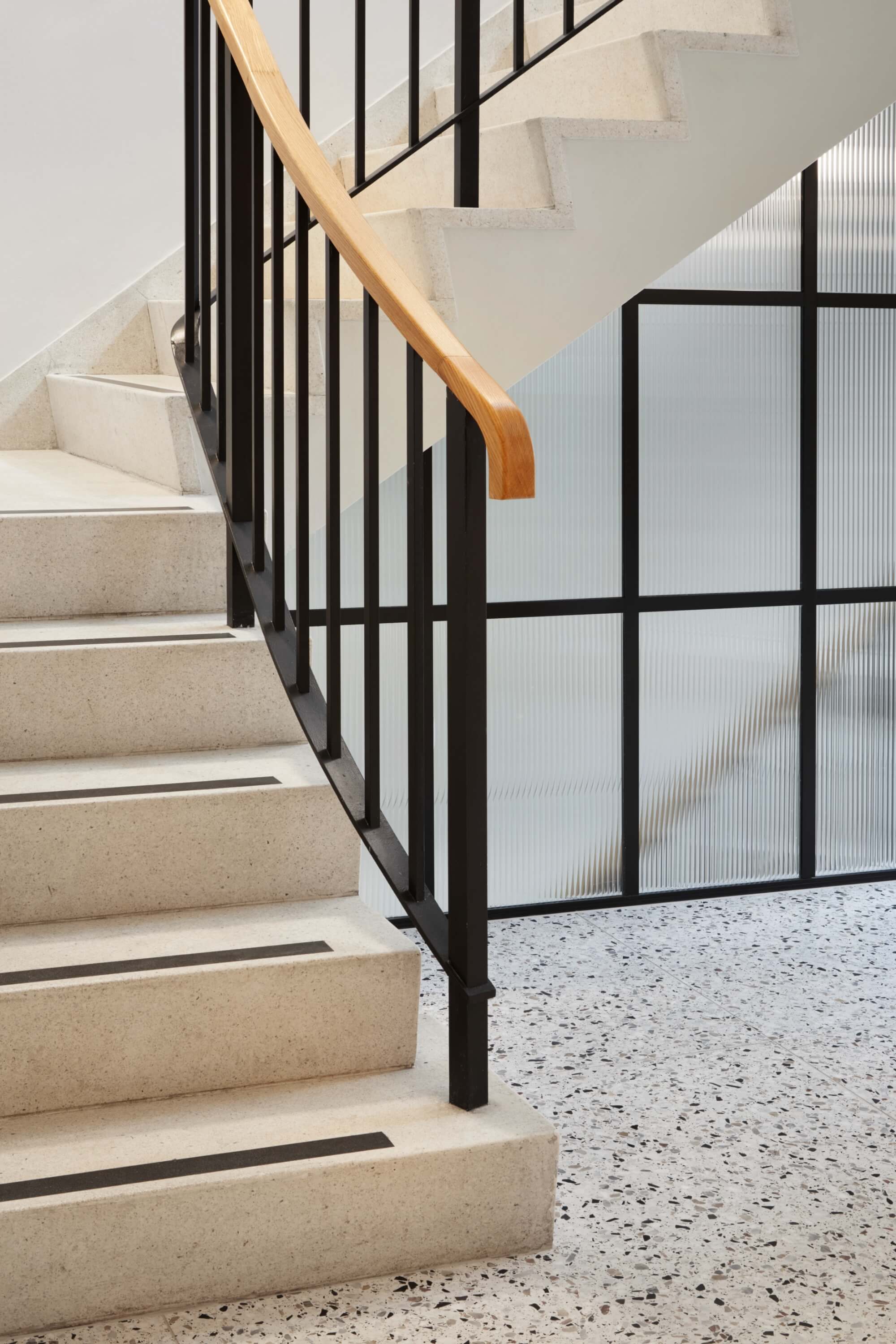 At ground level, the double-height banking hall is carefully reworked around a sculptural helical staircase, which introduces a clear sense of arrival and connects to a new mezzanine level without compromising the hall’s original proportions. Below, the conversion of the former vaults into showers and cycle storage ensures the building supports contemporary patterns of use, allowing its historic fabric to work hard for modern working life.