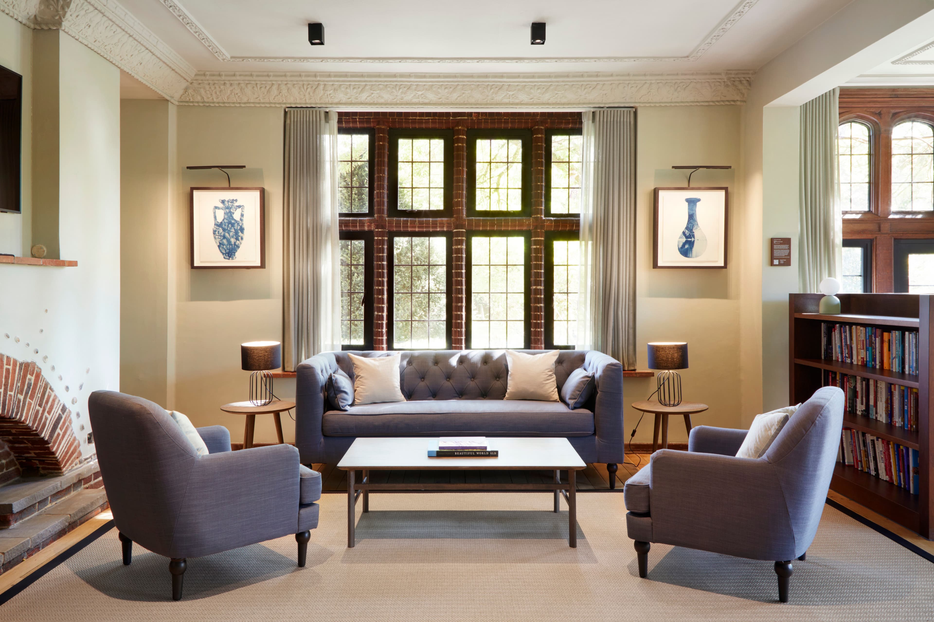 Four Acres is a beautiful, garden-set campus where restored Arts and Crafts character meets contemporary learning and hospitality. A new, welcoming reception improves access and coherence, while reconfigured interiors create calm spaces for dining, meeting, working and reflection. Warm natural materials, layered textures and carefully restored details evoke a domestic atmosphere that supports focus and connection. The result is an inviting, holistic environment that balances heritage, comfort and the needs of a modern leadership centre.