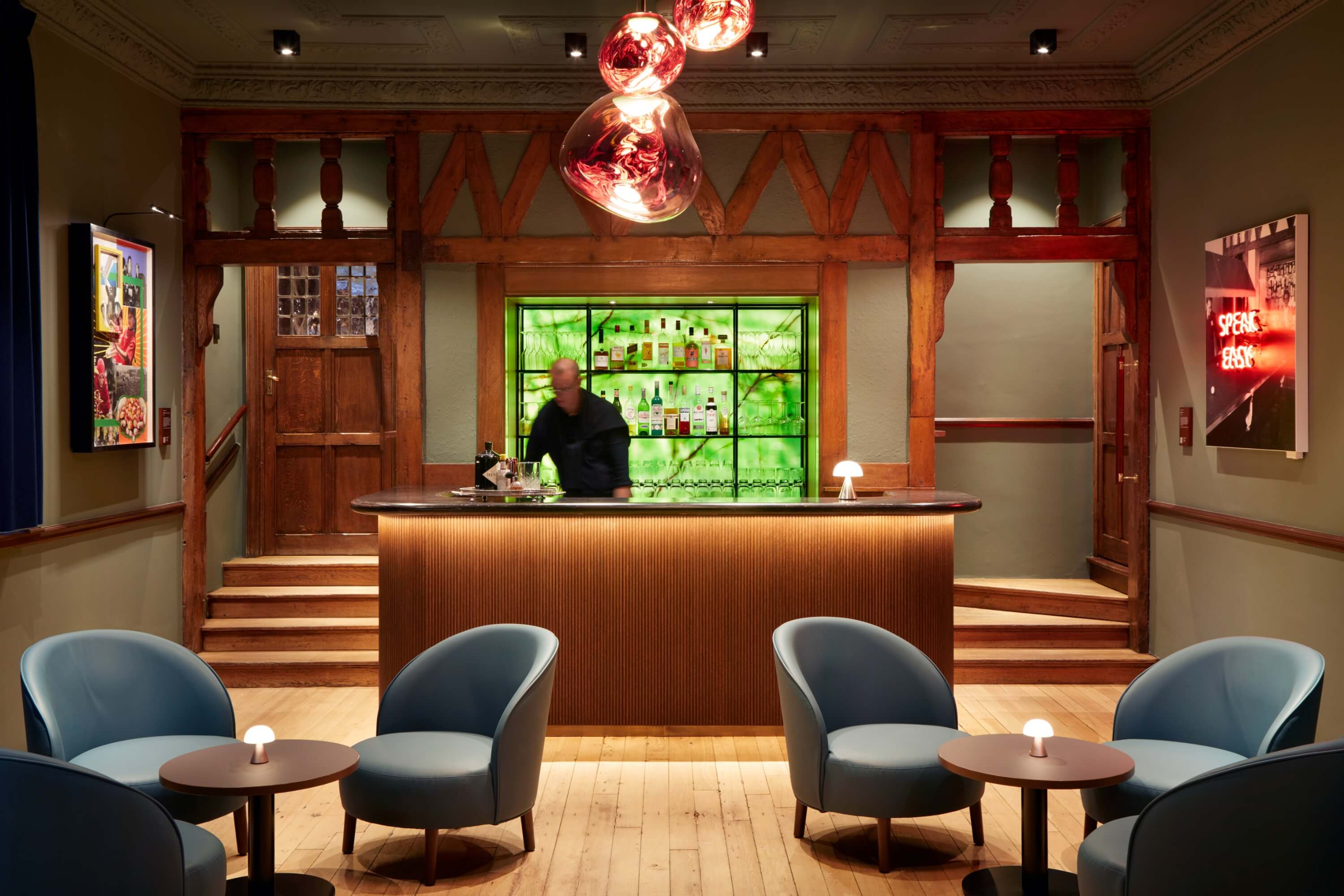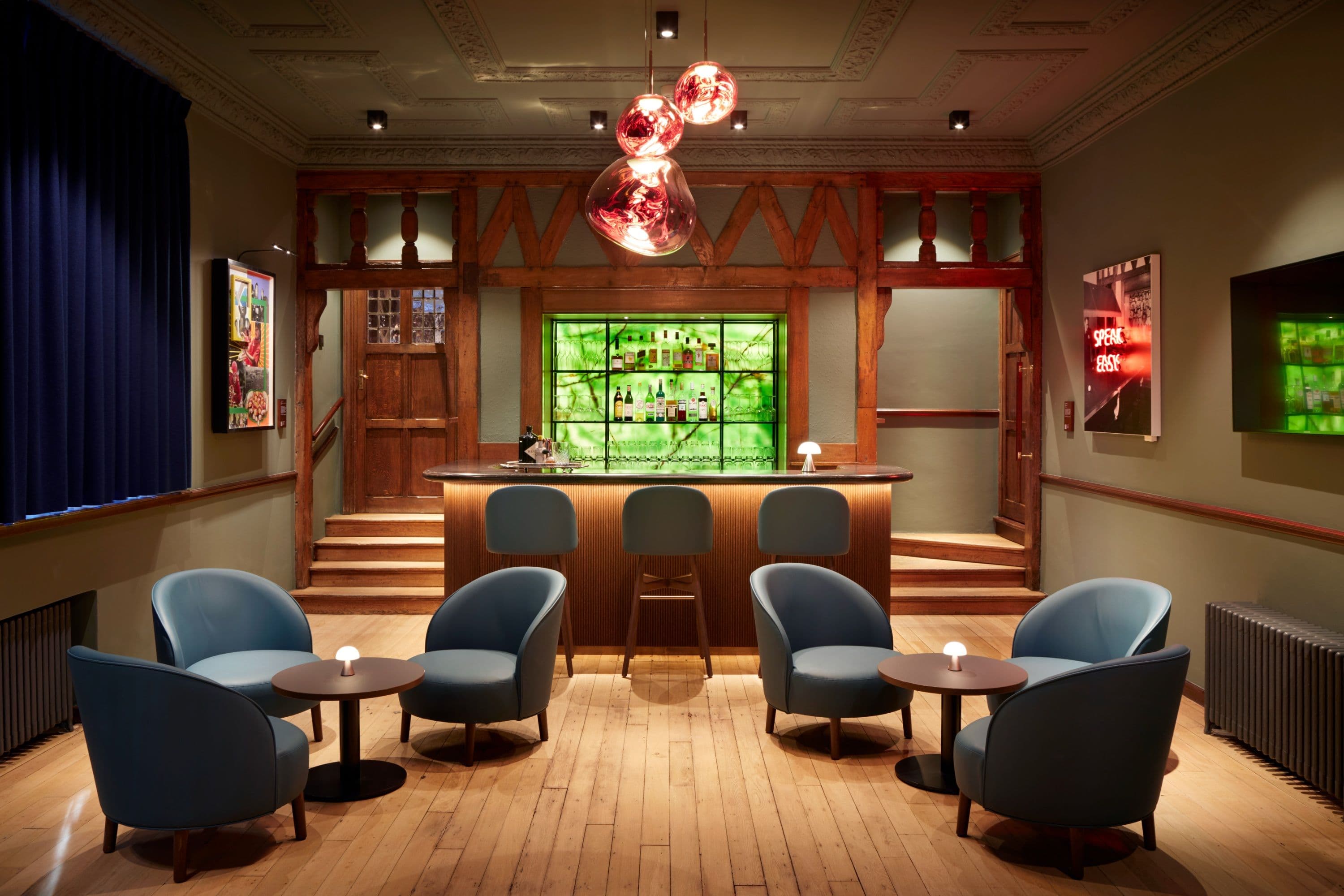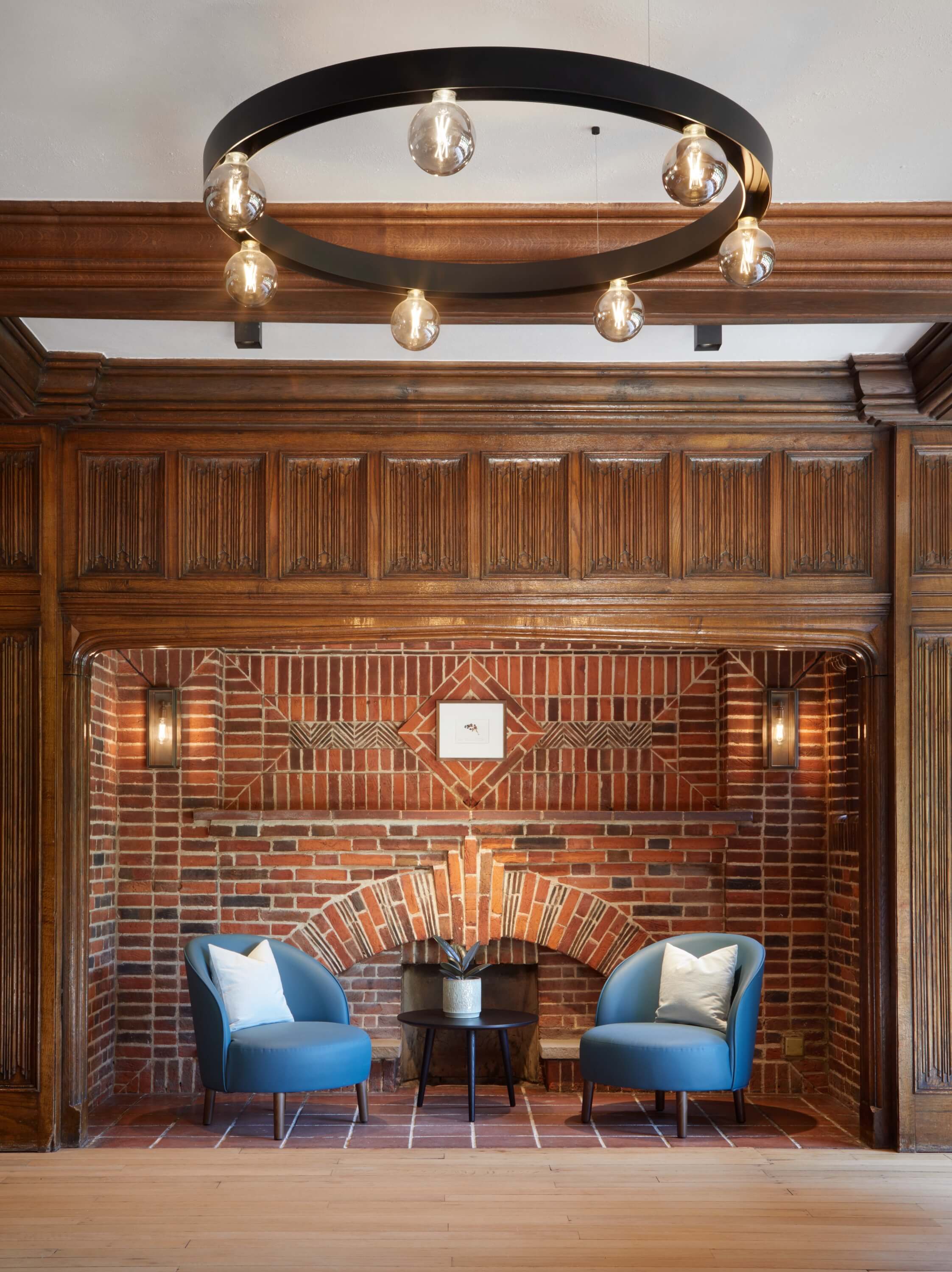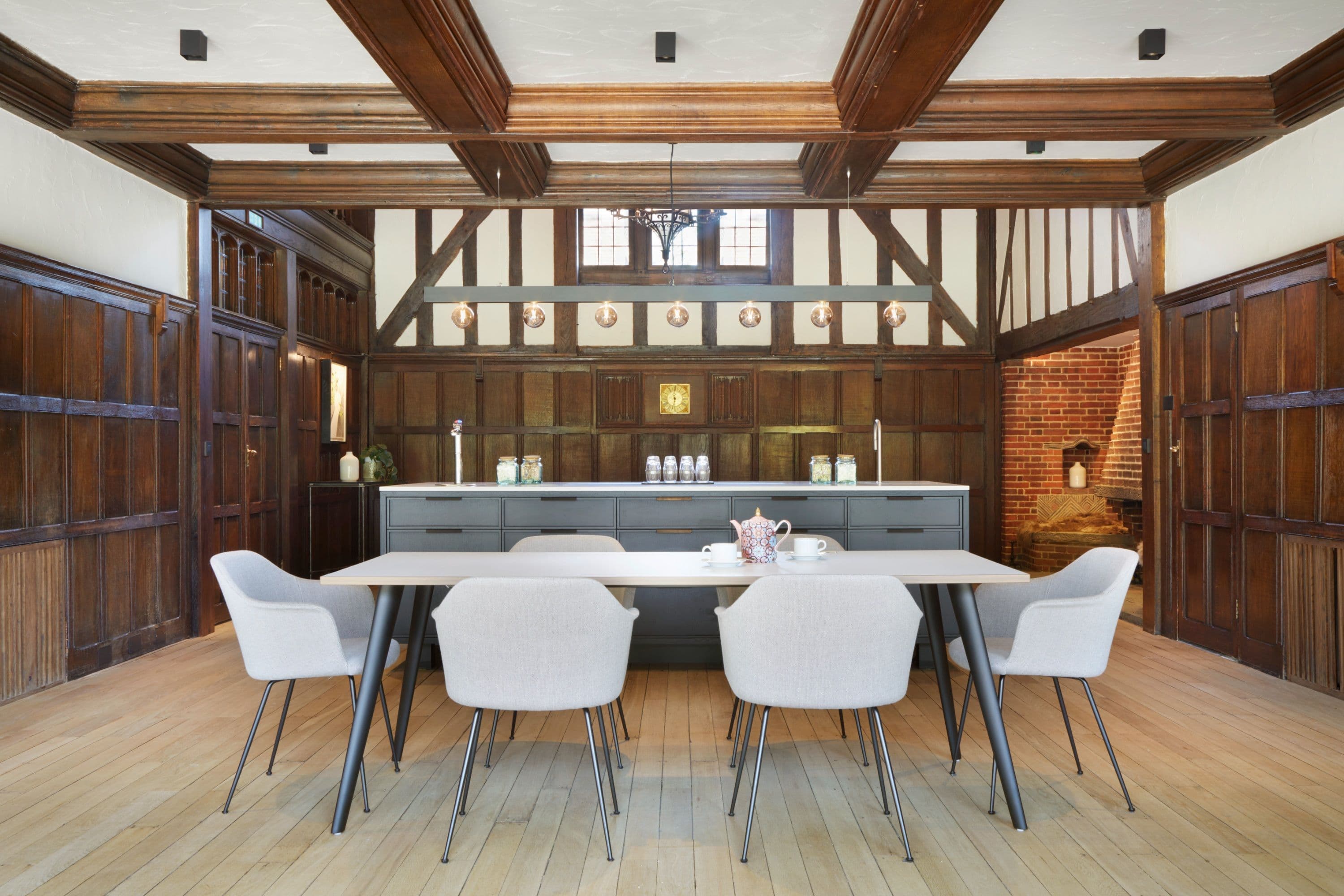 We extended the main entrance link building to form a generous, accessible reception that unifies the estate and signals a renewed sense of welcome. Inside, careful reconfiguration introduced flexible spaces for dining, meeting, workshops and quiet work, while the bar was returned to its original location to restore social heart and historical logic. Restored timberwork, fireplaces and Arts and Crafts details were paired with a warm, contemporary palette to create a calm, residential feel.
