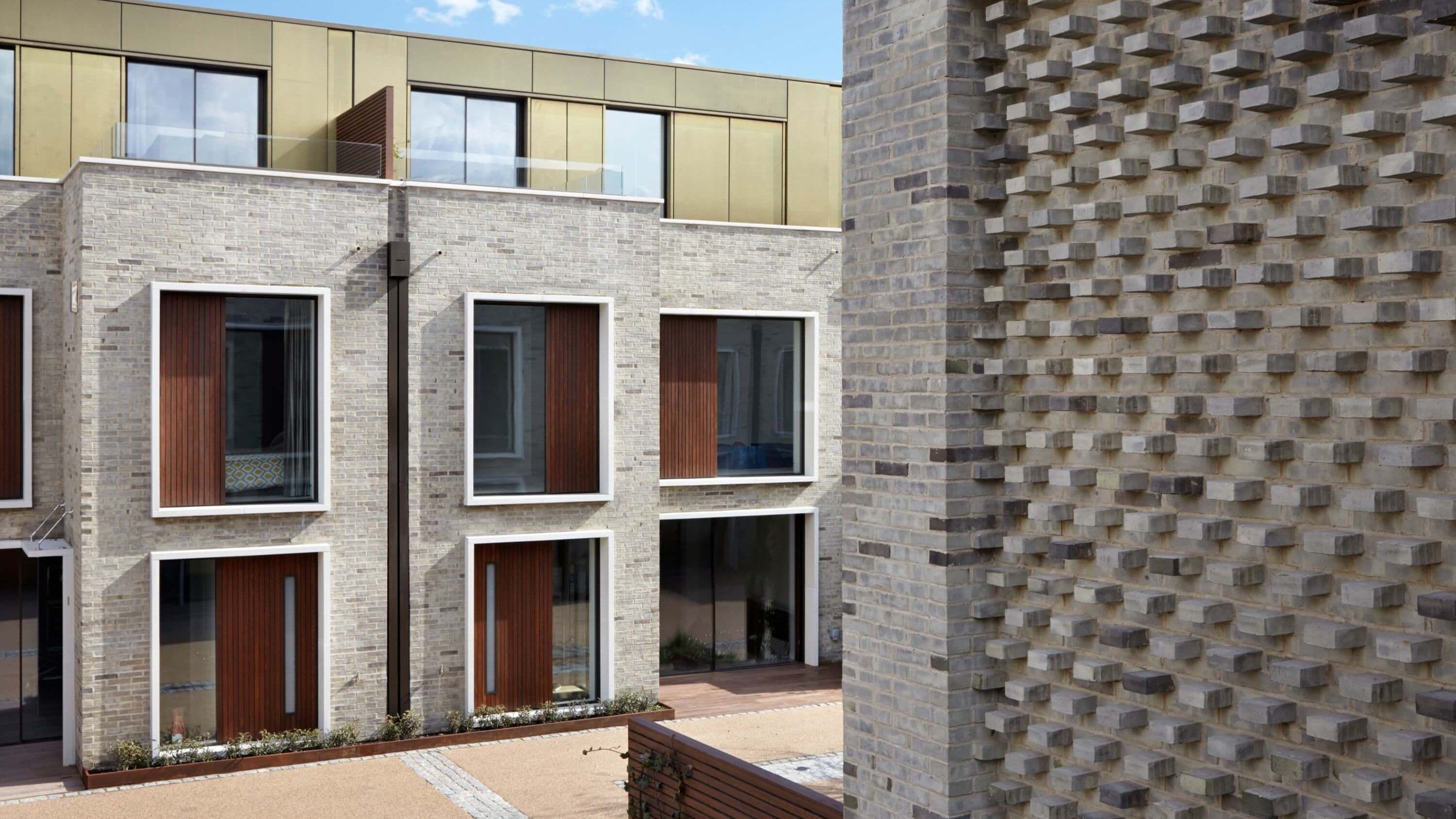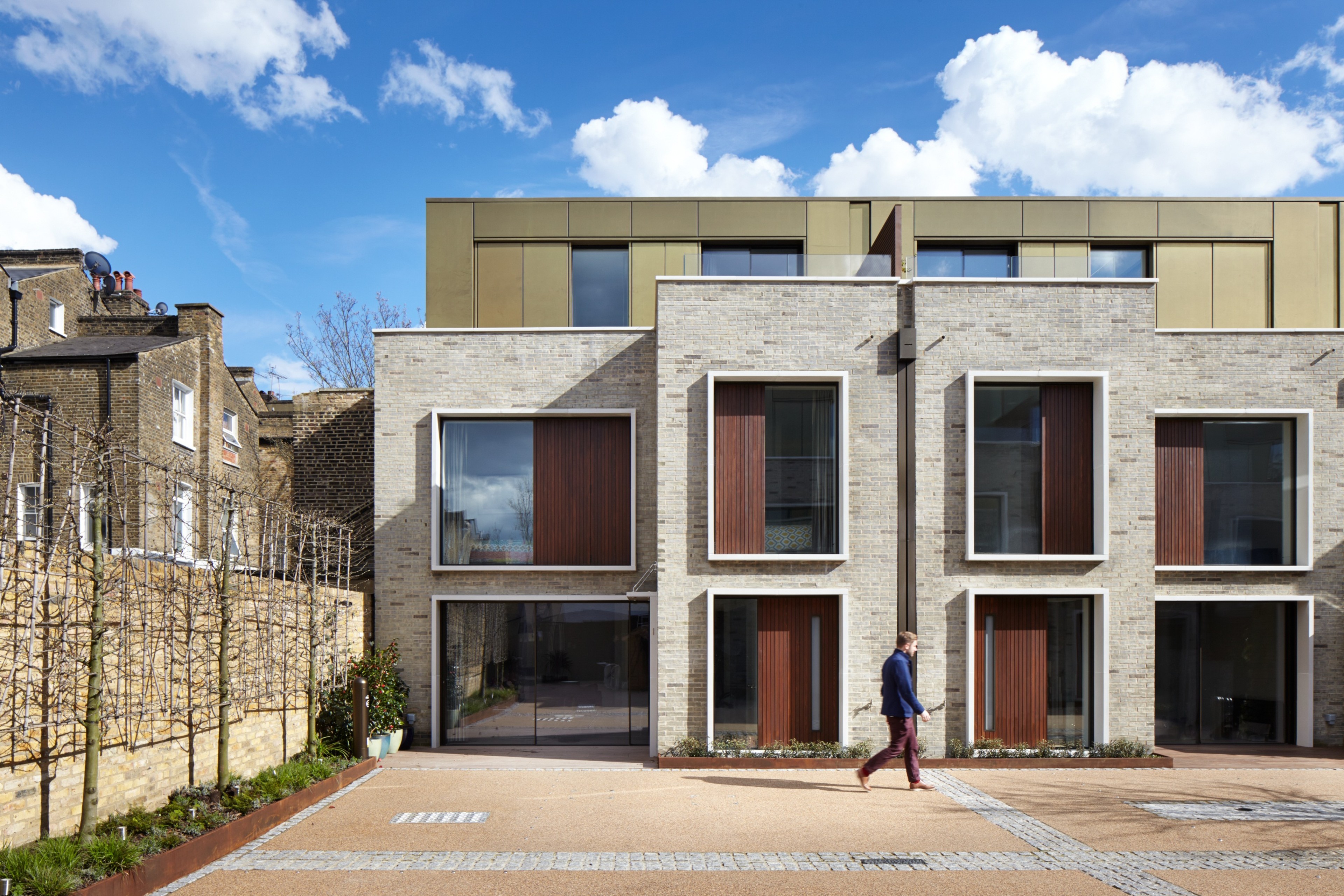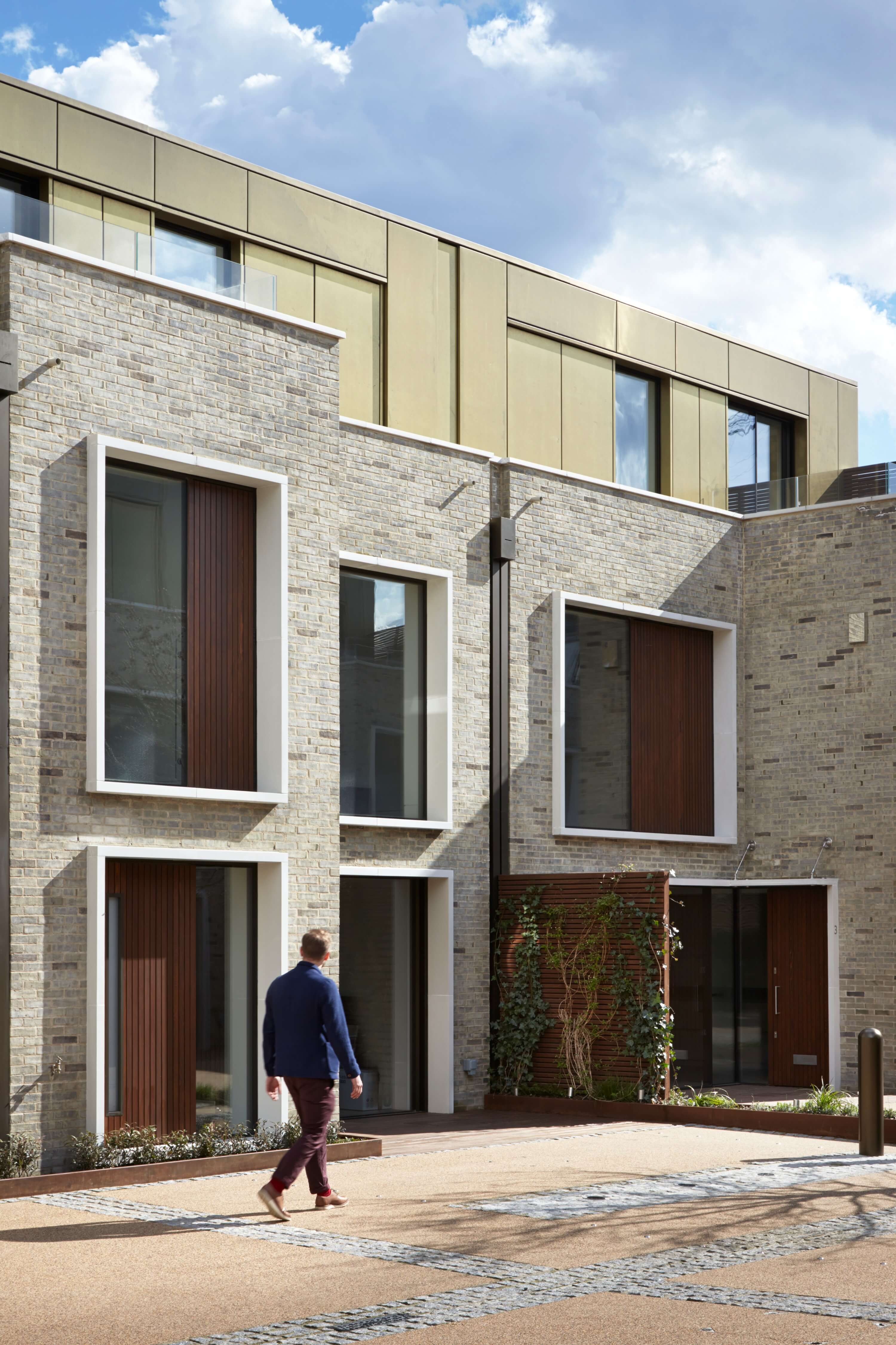 Material choices emphasise longevity and craft. Handmade Danish grey bricks with flush pointing are paired with pale resin-stone surrounds that recall mid-century mews architecture, while western red cedar softens the opening panels and reduces visible frame sizes. Above, Tecu brass wraps the upper level, weathering to a muted, tarnished bronze over time. High insulation, triple glazing, rainwater harvesting, PVs, sedum roofs, SUDS, EV charging and whole-house ventilation ensure the homes perform efficiently and reliably over the long term.