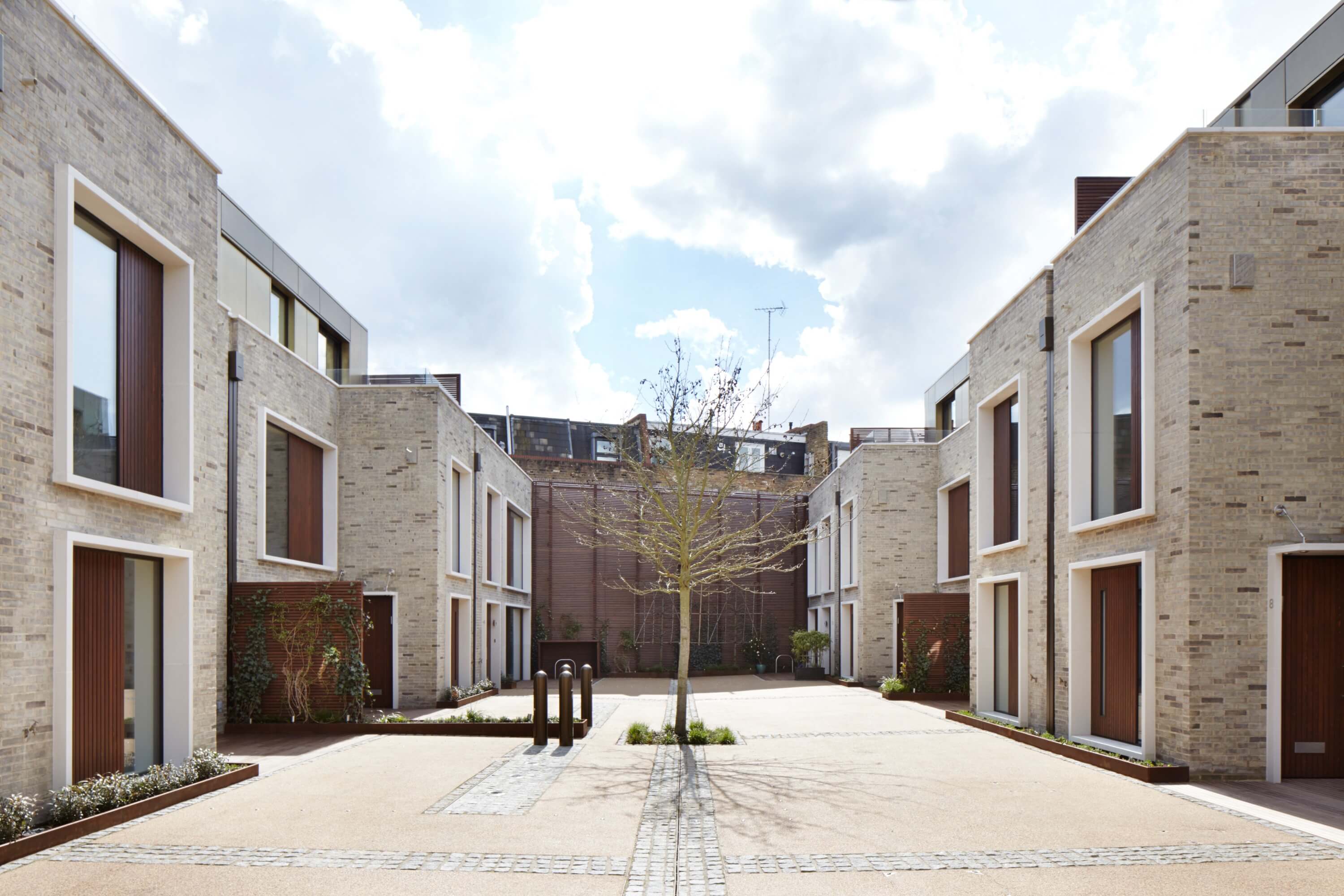 Goldney Road is tucked away – a private mews gathered around a generously landscaped courtyard. Large, carefully spaced windows bring daylight deep into each home, drawing views between terraces and the shared green space outside. Handmade Danish bricks, pale stone surrounds and cedar panels give the façades warmth and texture, settling comfortably into the setting. The architecture feels crafted and calm, with brickwork details and planting quietly shaping the character of the place. The scheme achieves Code for Sustainable Homes Level 4.