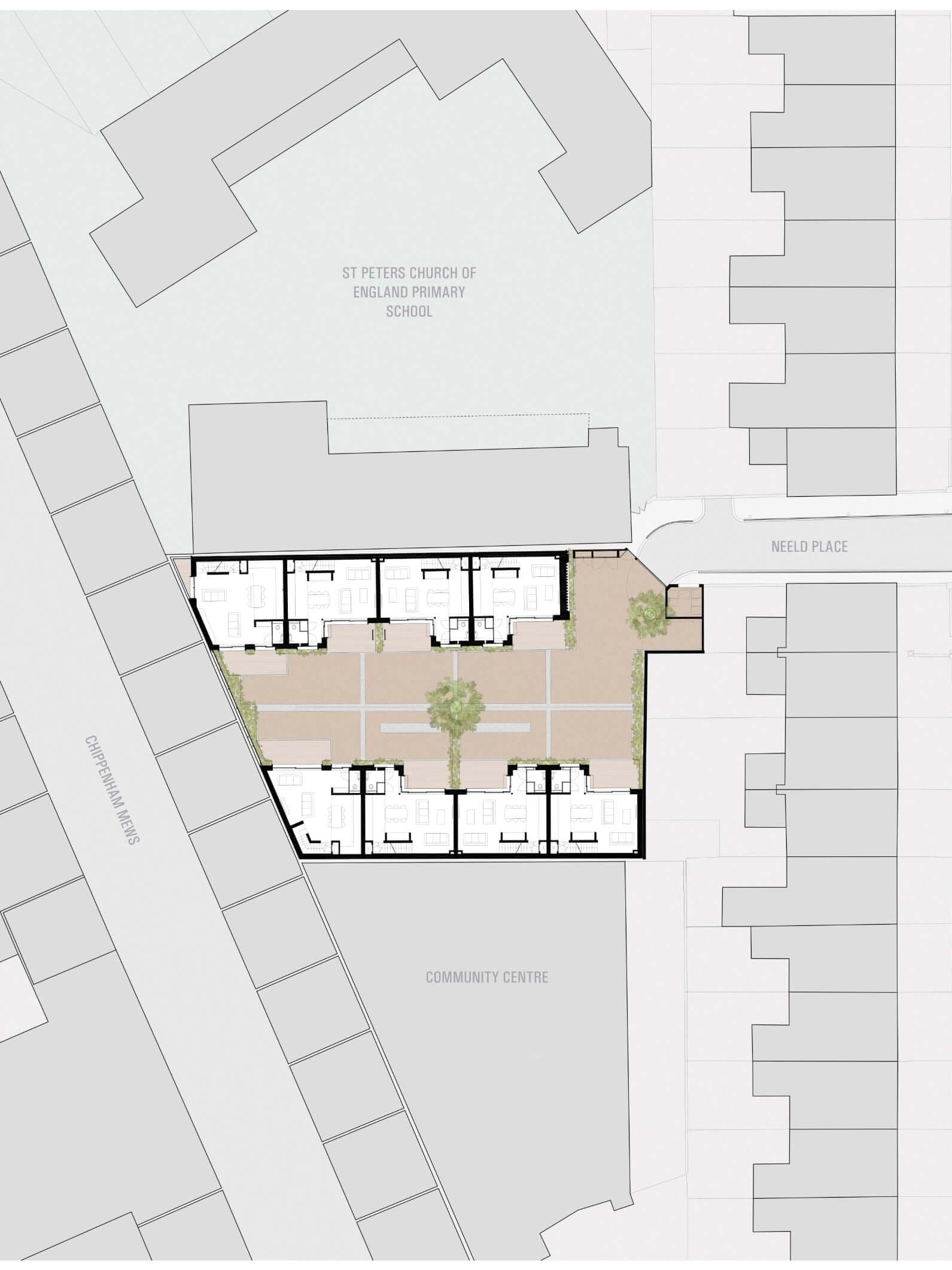 The site itself was previously a taxi repair yard – a constrained brownfield plot with little inherent character. Our aim was to reinterpret it as a place people would feel connected to: organised around a landscaped courtyard, with shared areas that encourage community, and private terraces that allow life to spill outdoors. The new mews plan turns a leftover piece of city into a setting for everyday domestic life, rooted in nature and neighbourliness.