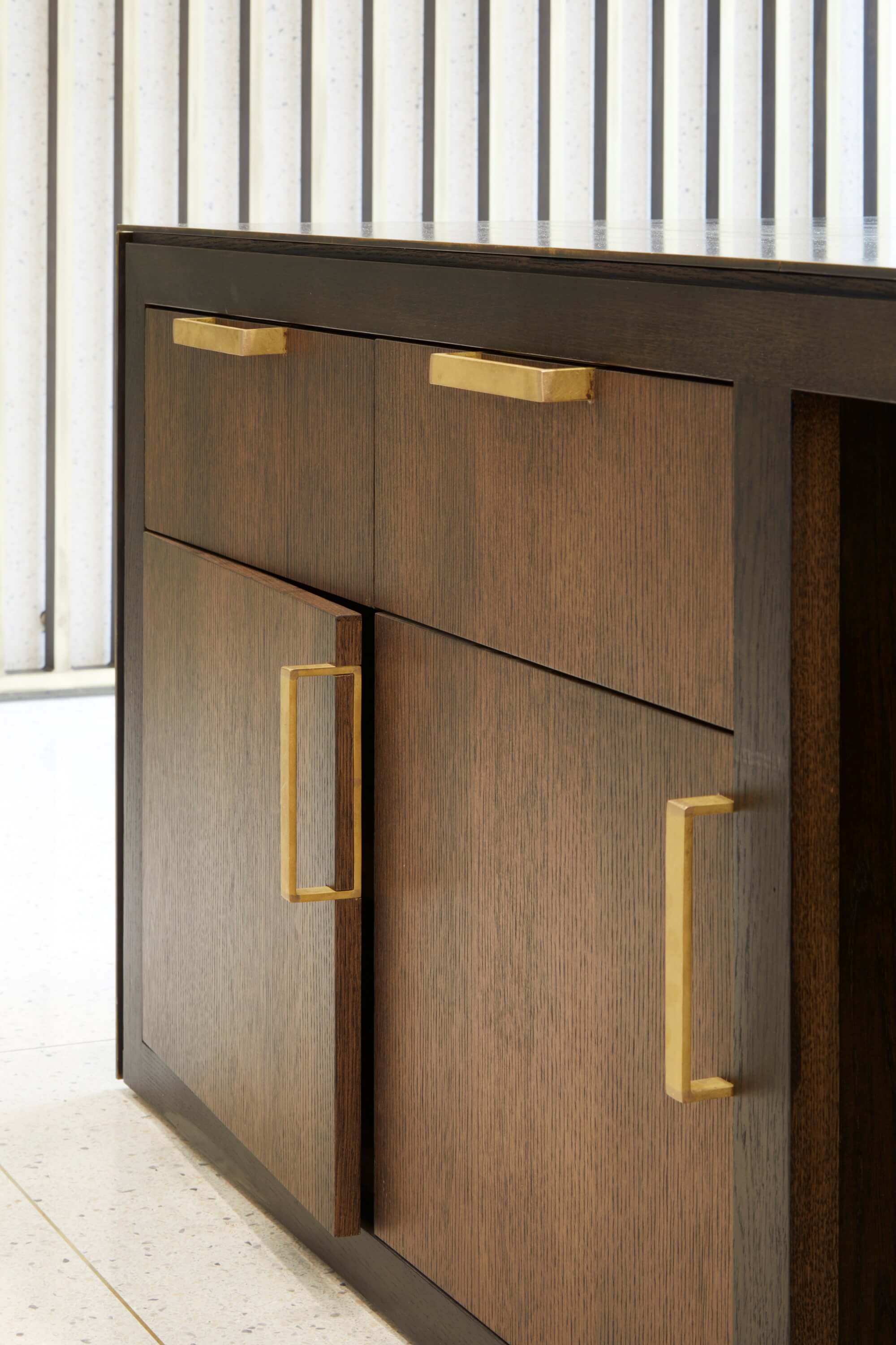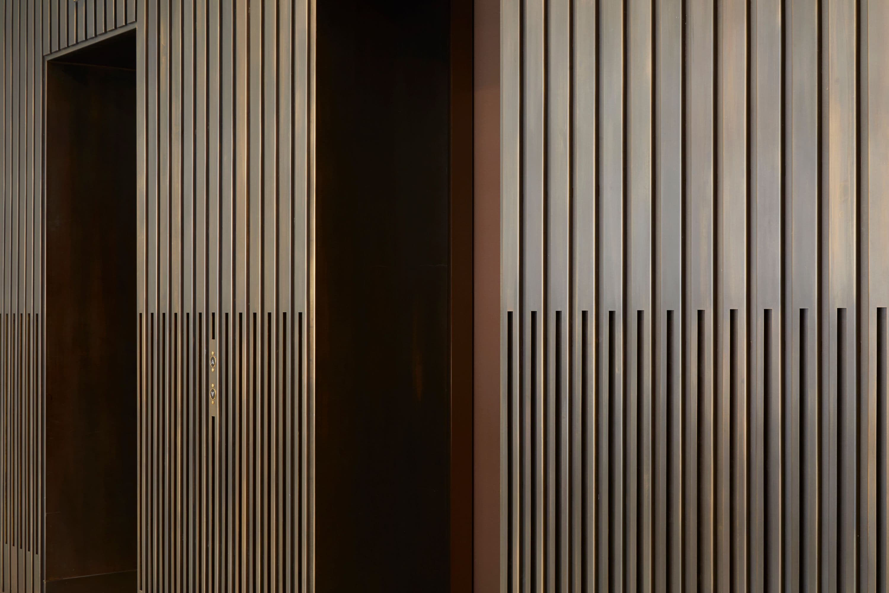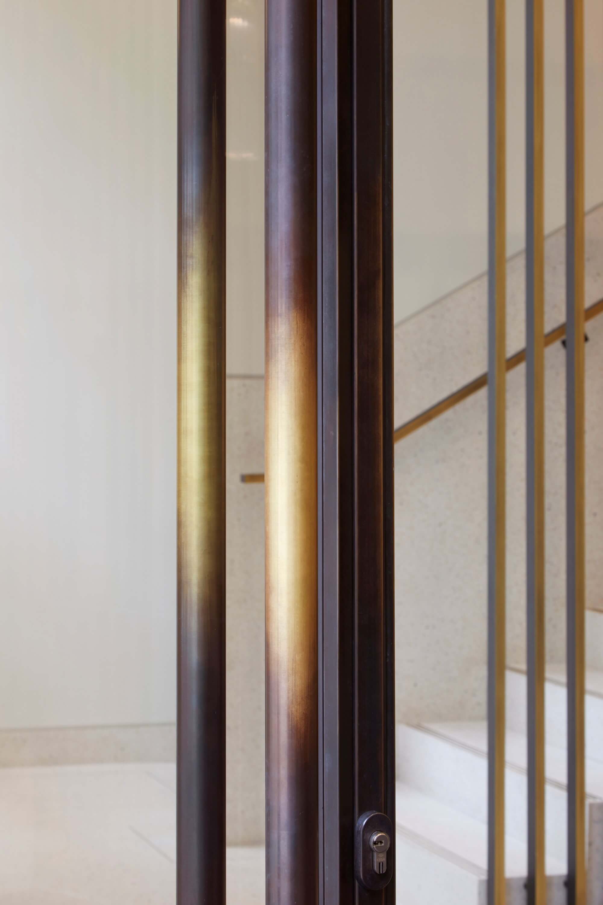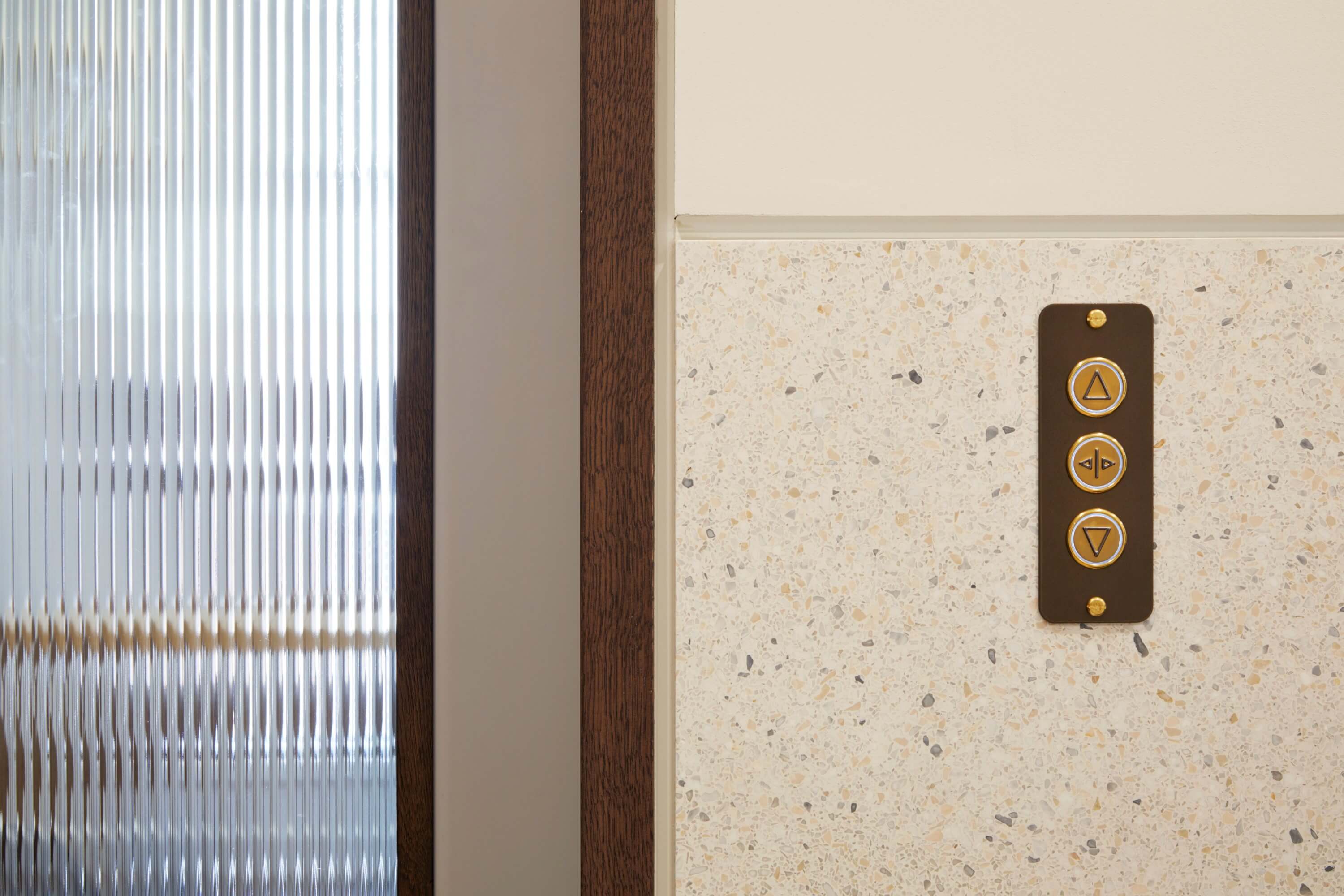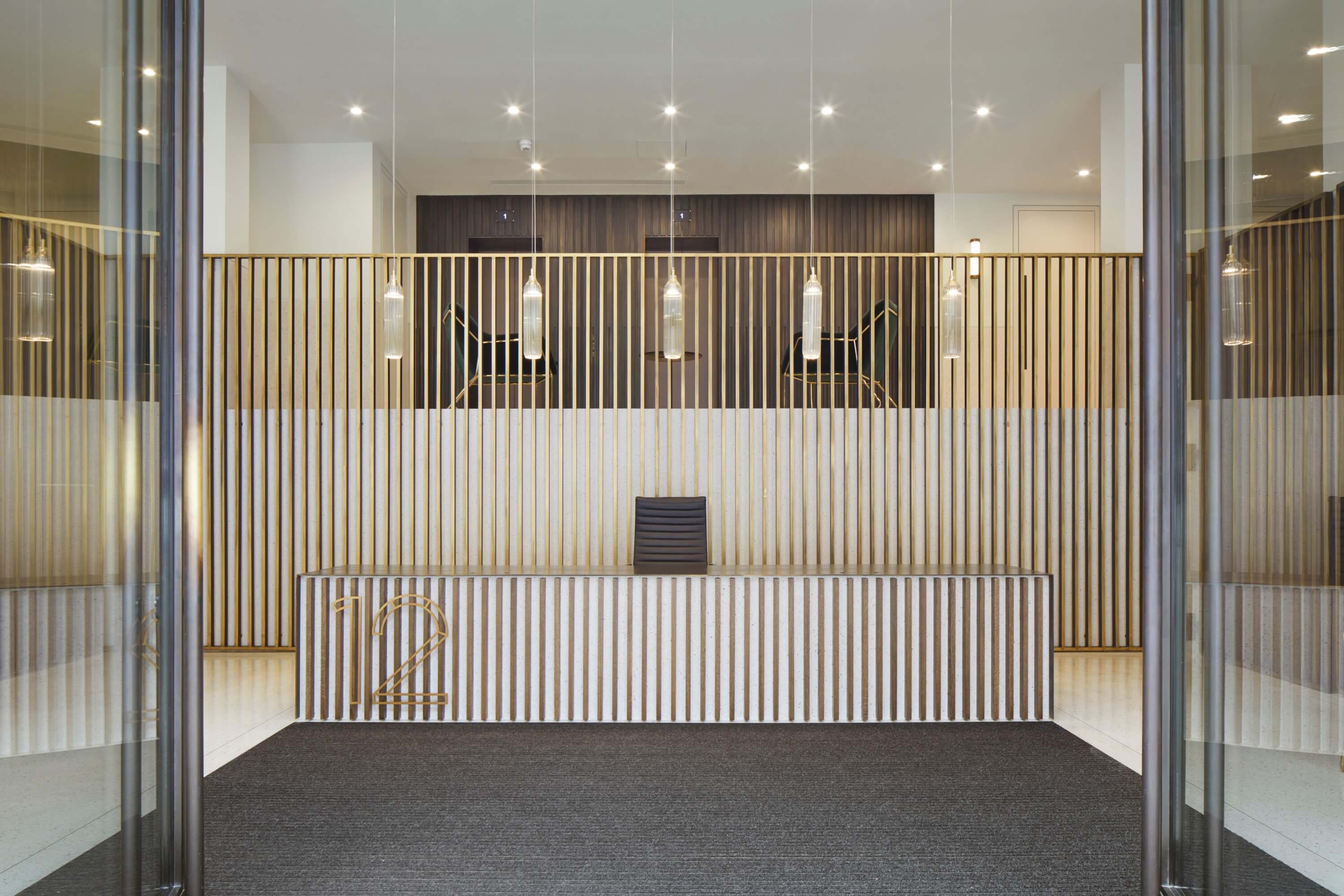 A multi-phase strategy allowed works to be delivered while the building remained occupied. The first focus was the reception, where an awkward level change, anonymous styling and heavy existing structure created a difficult arrival. Our response introduces a carefully crafted interior, gently concealing the level change and placing a discreet platform lift behind a bronzed steel fin screen, improving accessibility while maintaining a composed, open space.