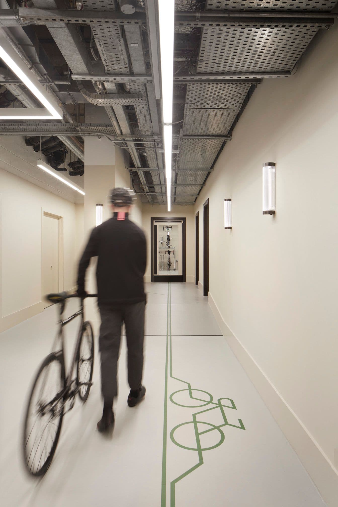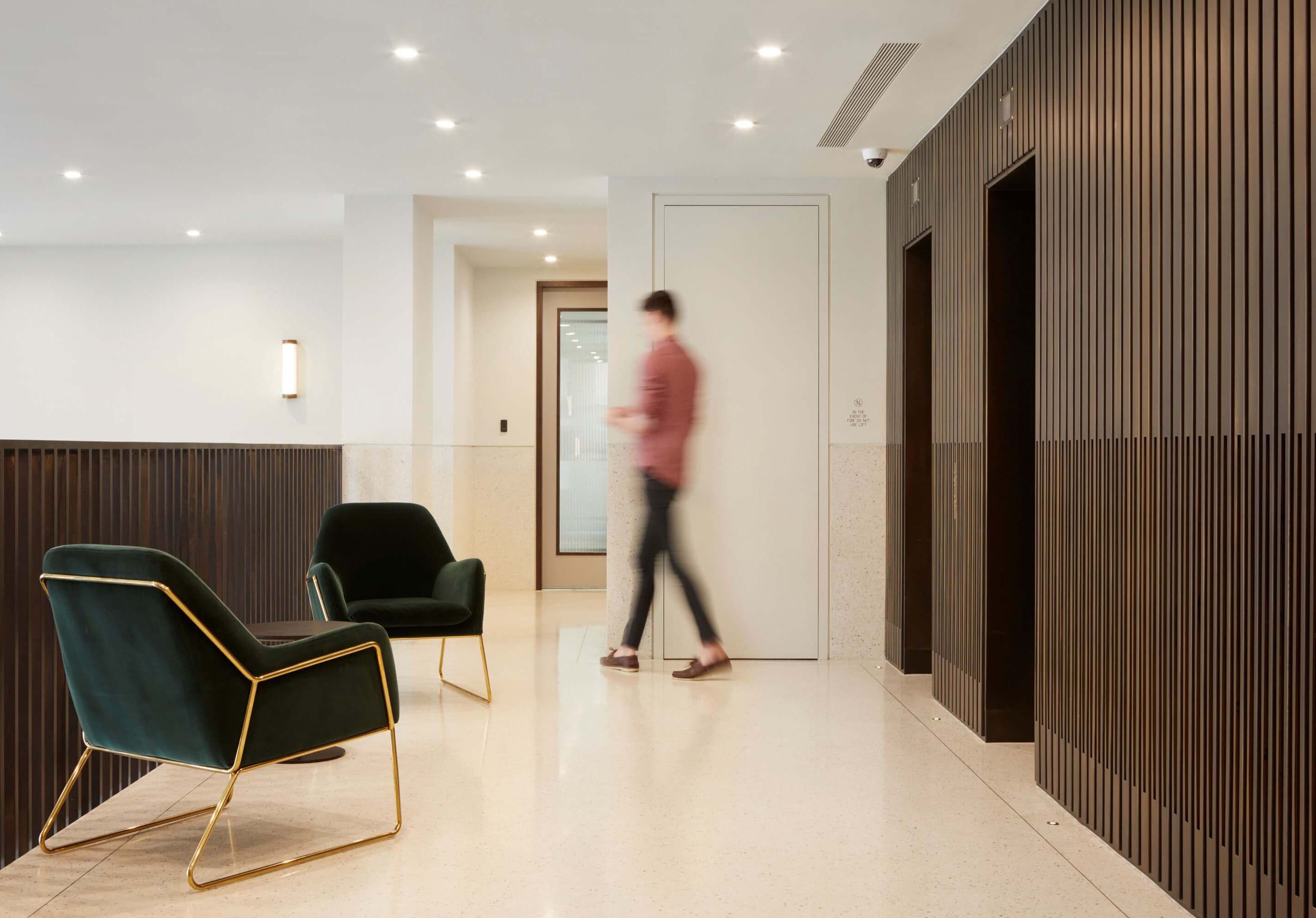 A tired basement was transformed into a wellness and end-of-trip hub, supported by a bespoke wayfinding system that guides people seamlessly through interior and exterior routes. Across floors and common parts, durable materials – terrazzo, refined metalwork, carefully detailed joinery – deliver continuity and longevity. The building now works harder, feels better to use and offers meaningful amenities that elevate everyday working life.