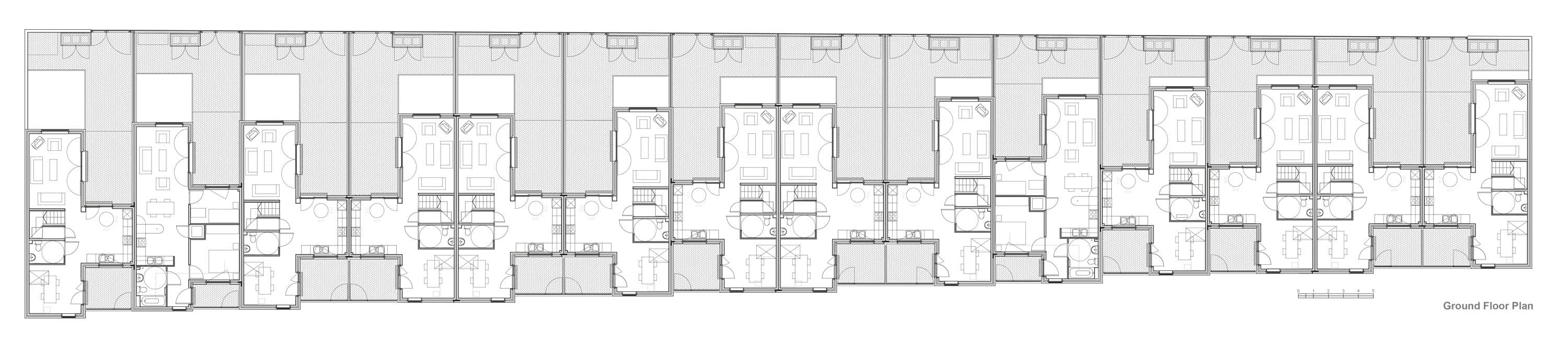 Internally, the T-shaped plans enable both open and cellular configurations, allowing households to adapt their homes over time without compromising architectural clarity. Large windows frame views and draw daylight deep into each home, reinforcing a sense of openness. This resident-led approach – listening to what people valued in their previous homes and what they wanted to change – underpins the project’s success. The result is a robust, generous and deeply responsive terrace that feels simultaneously new and familiar.