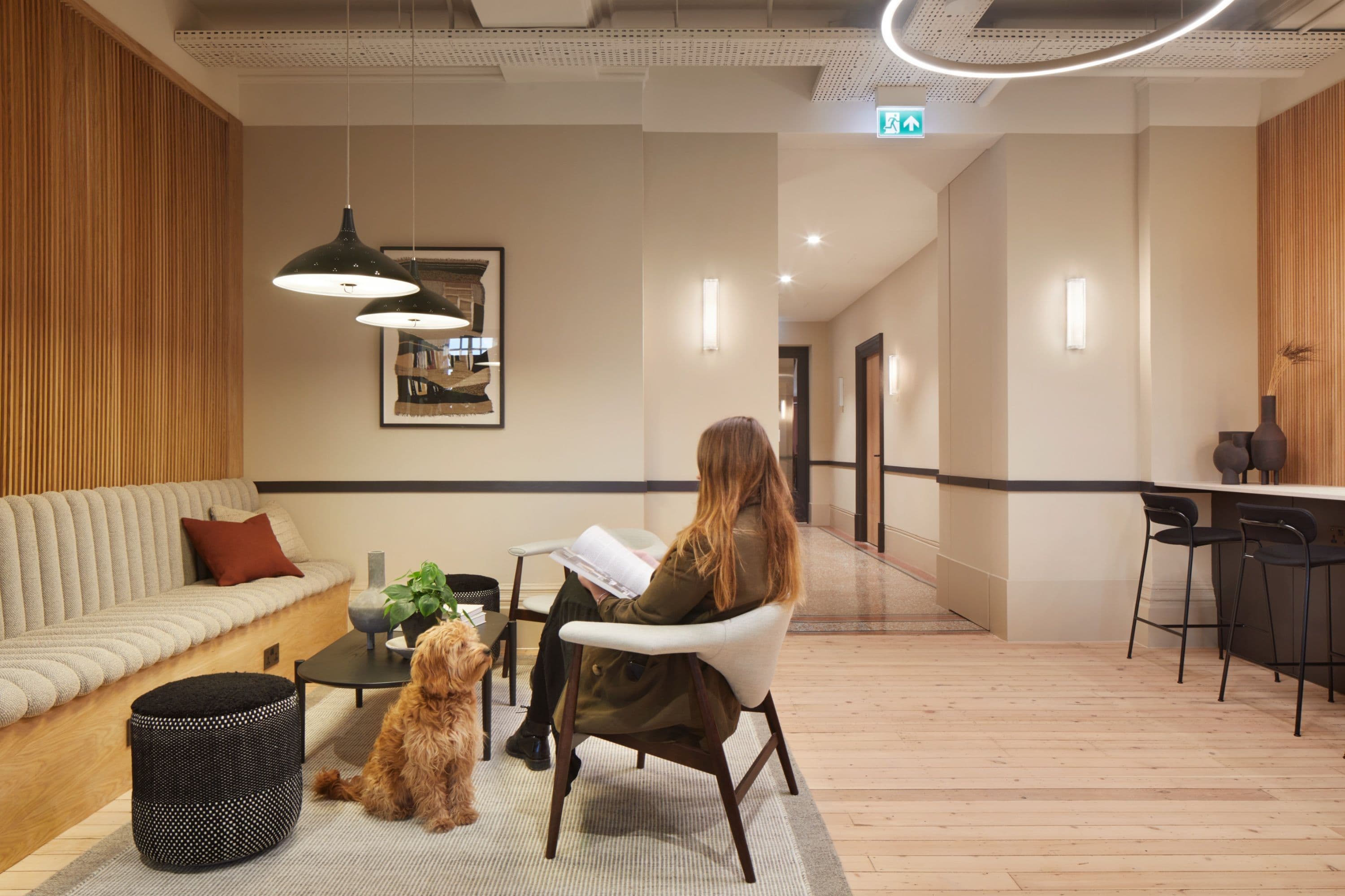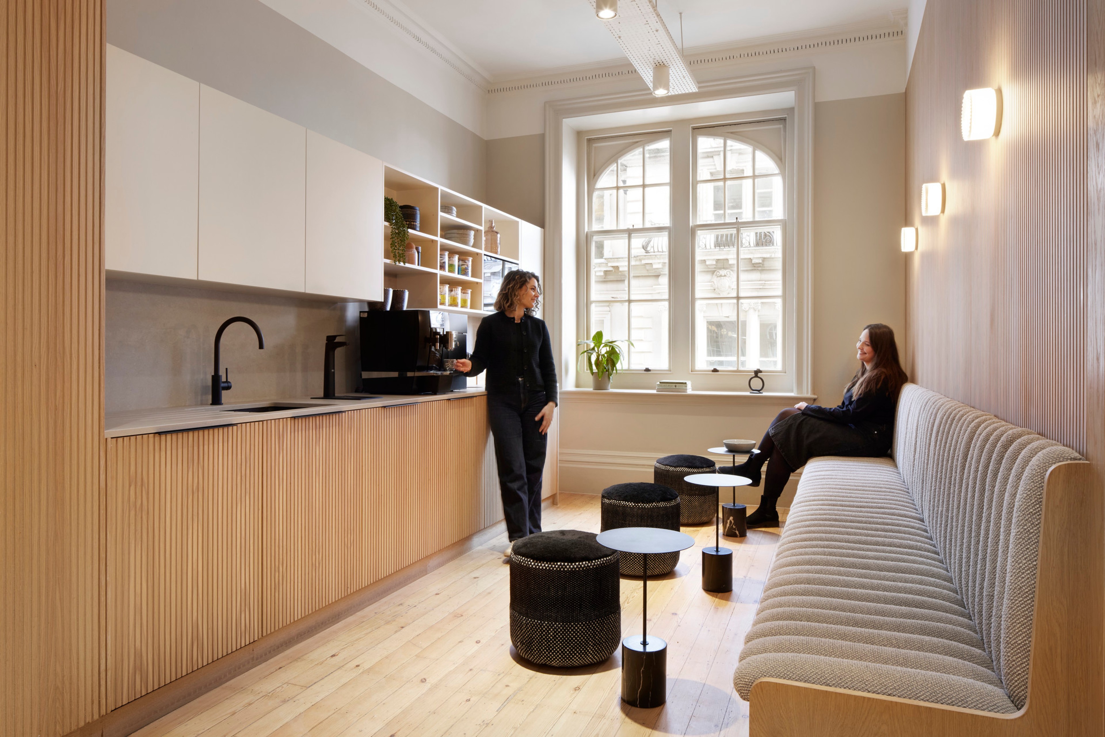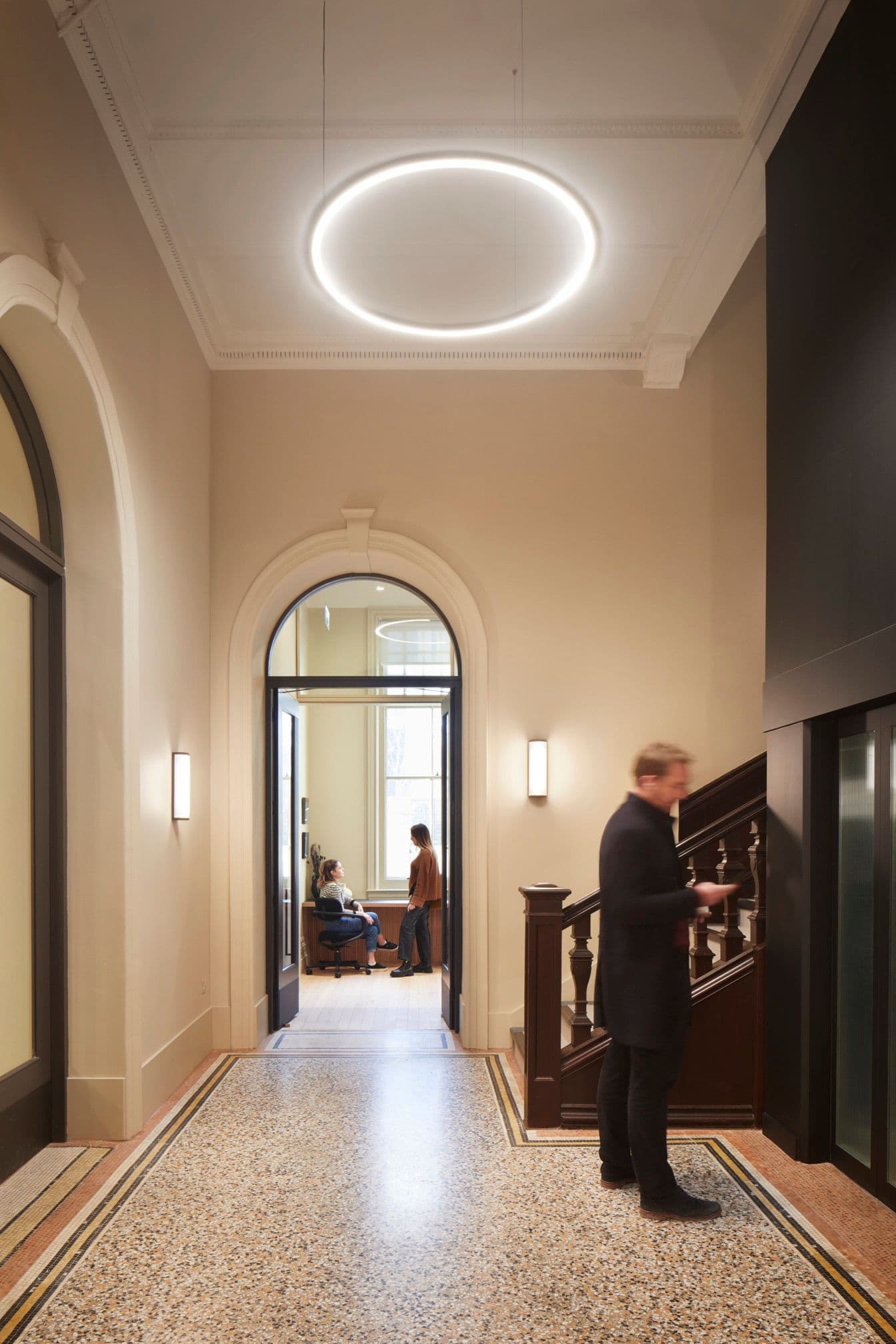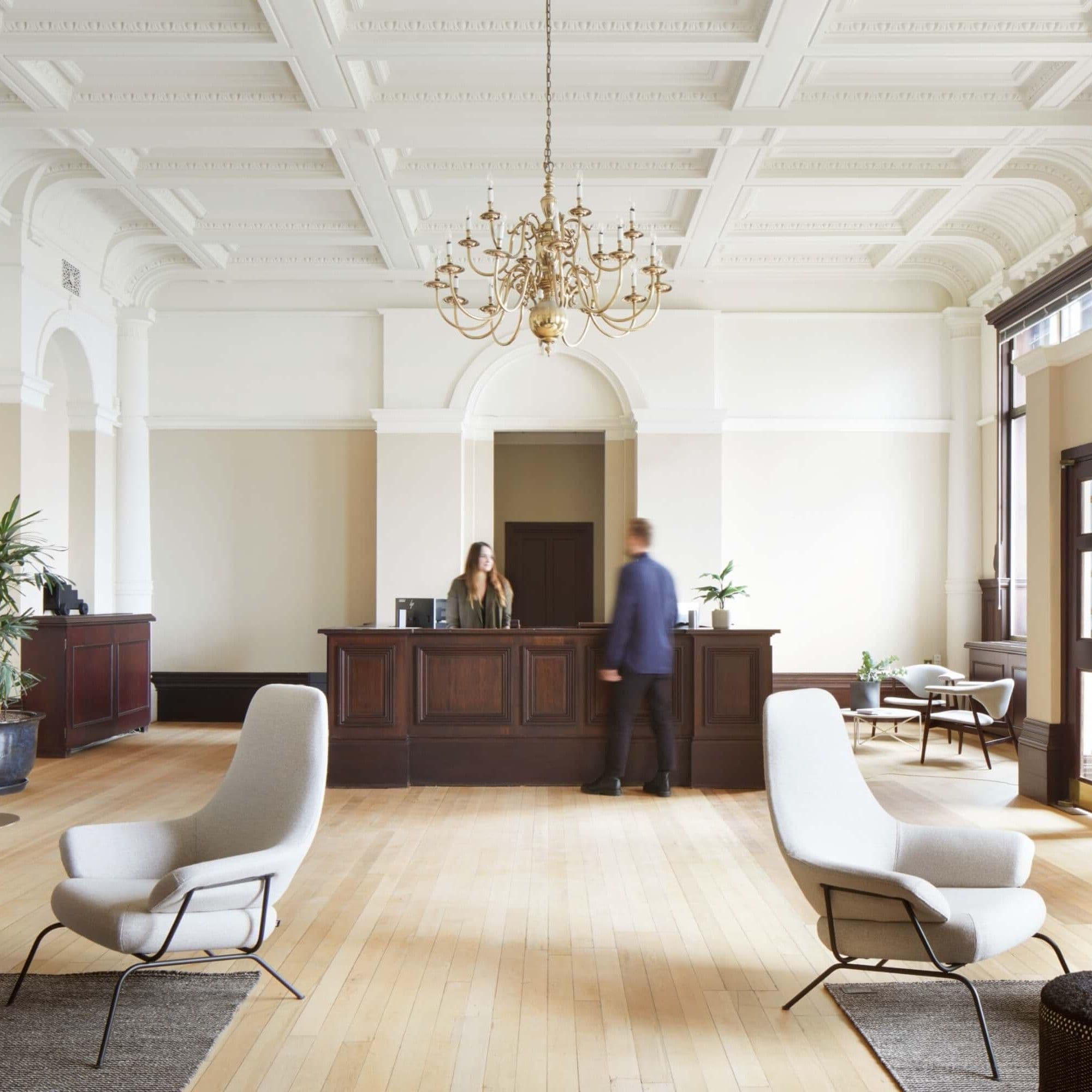 Our approach focused on evolving the story of Hamilton House – protecting its future rather than practising slavish preservation. Layers of past fit-outs were peeled back to reveal the building’s inherent character: suspended ceilings were removed, high-level windows reopened and atriums reinstated to draw daylight deep into the plan. Terrazzo, decorative plaster arches and extensive timber detailing were restored and complemented by a calm contemporary palette, while the reception was sensitively reconfigured to improve clarity and flow.