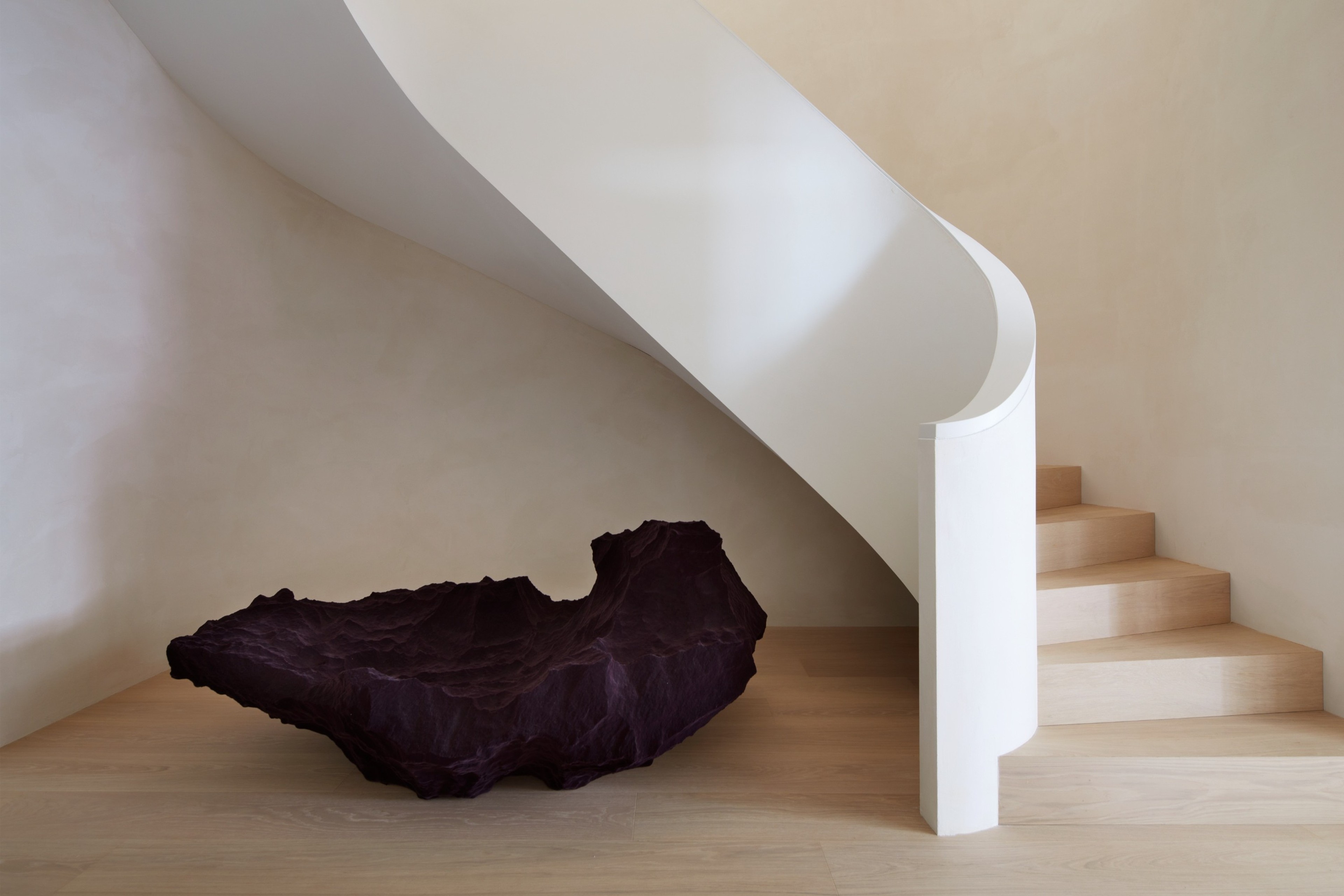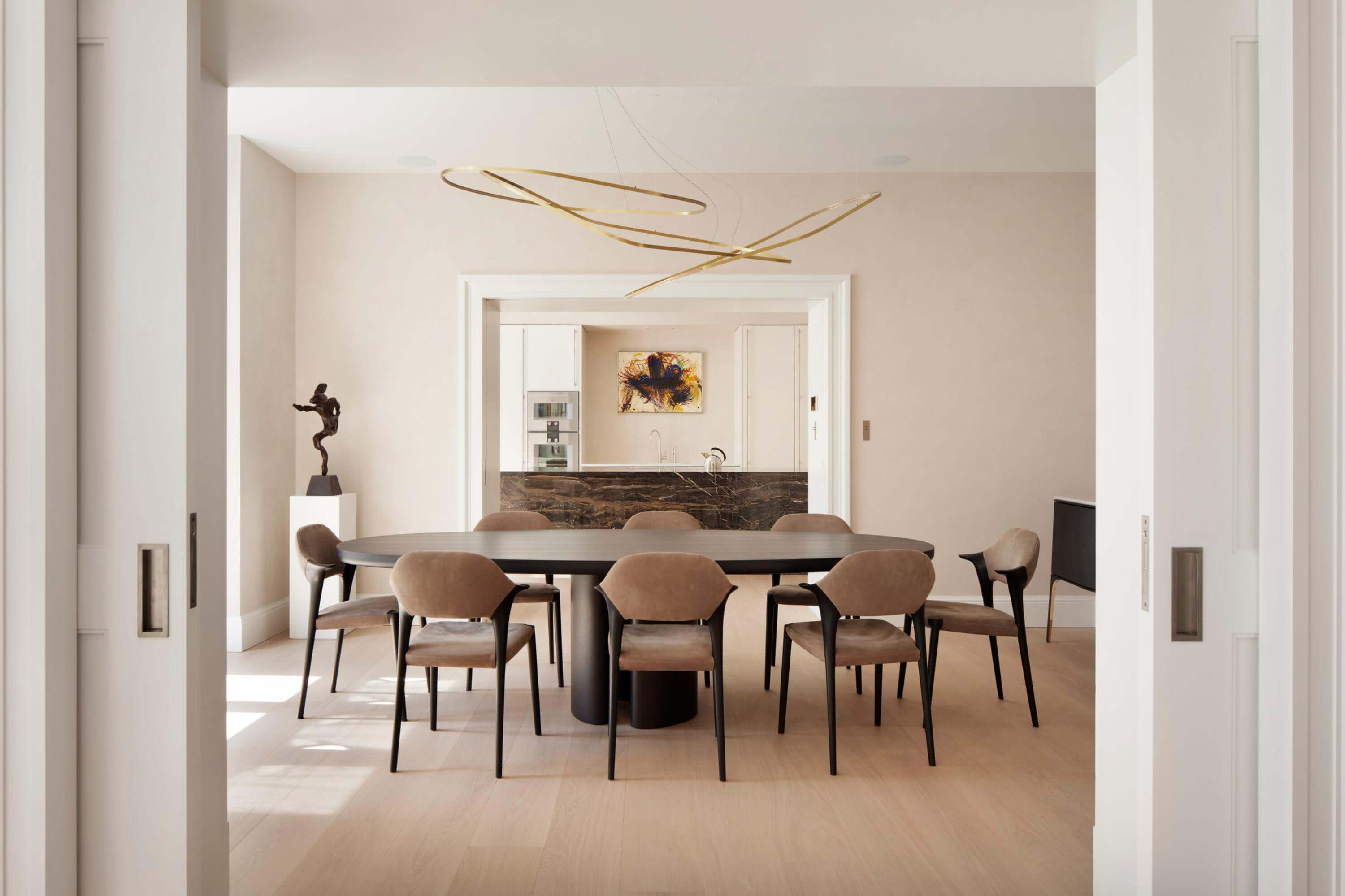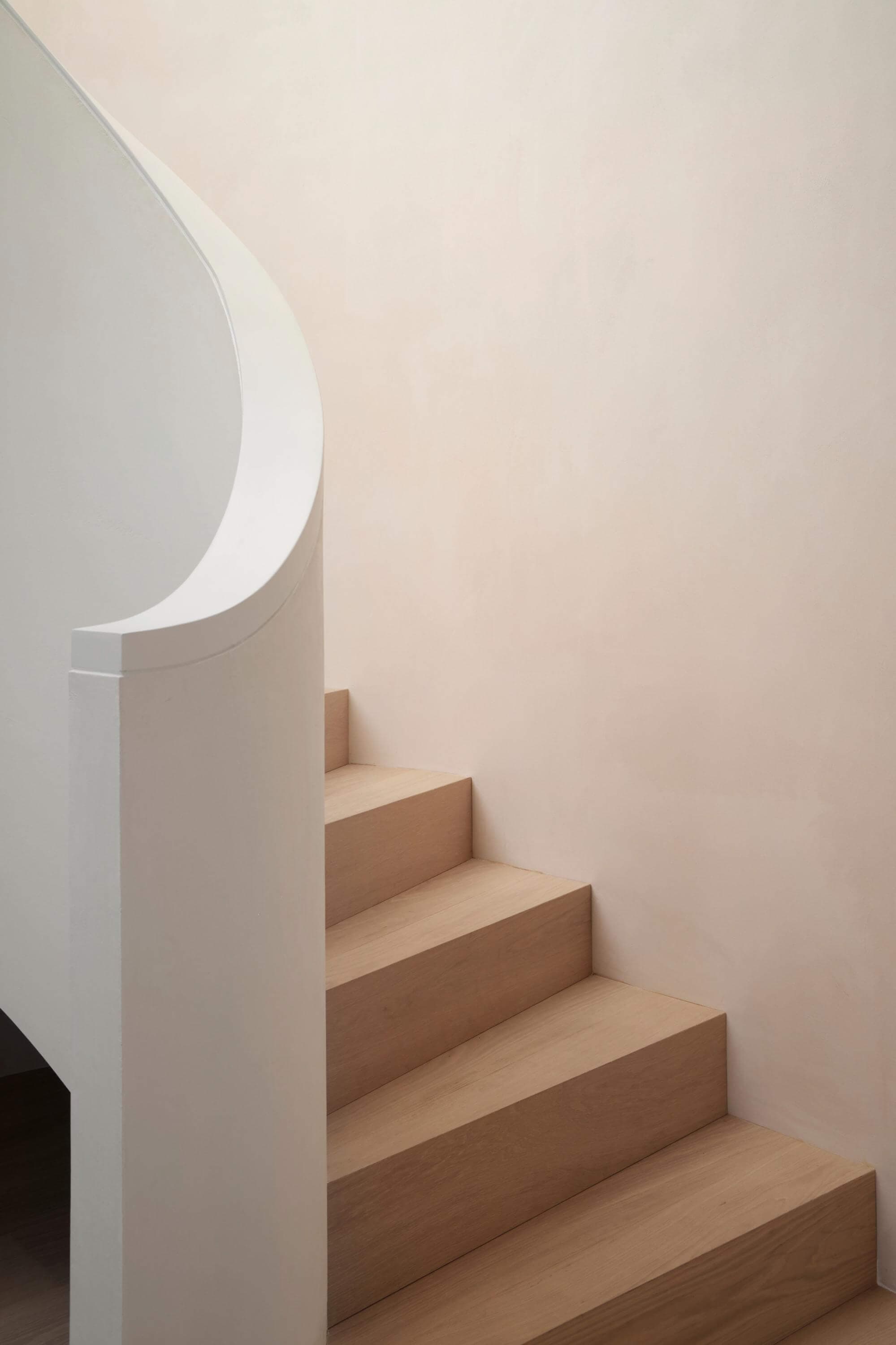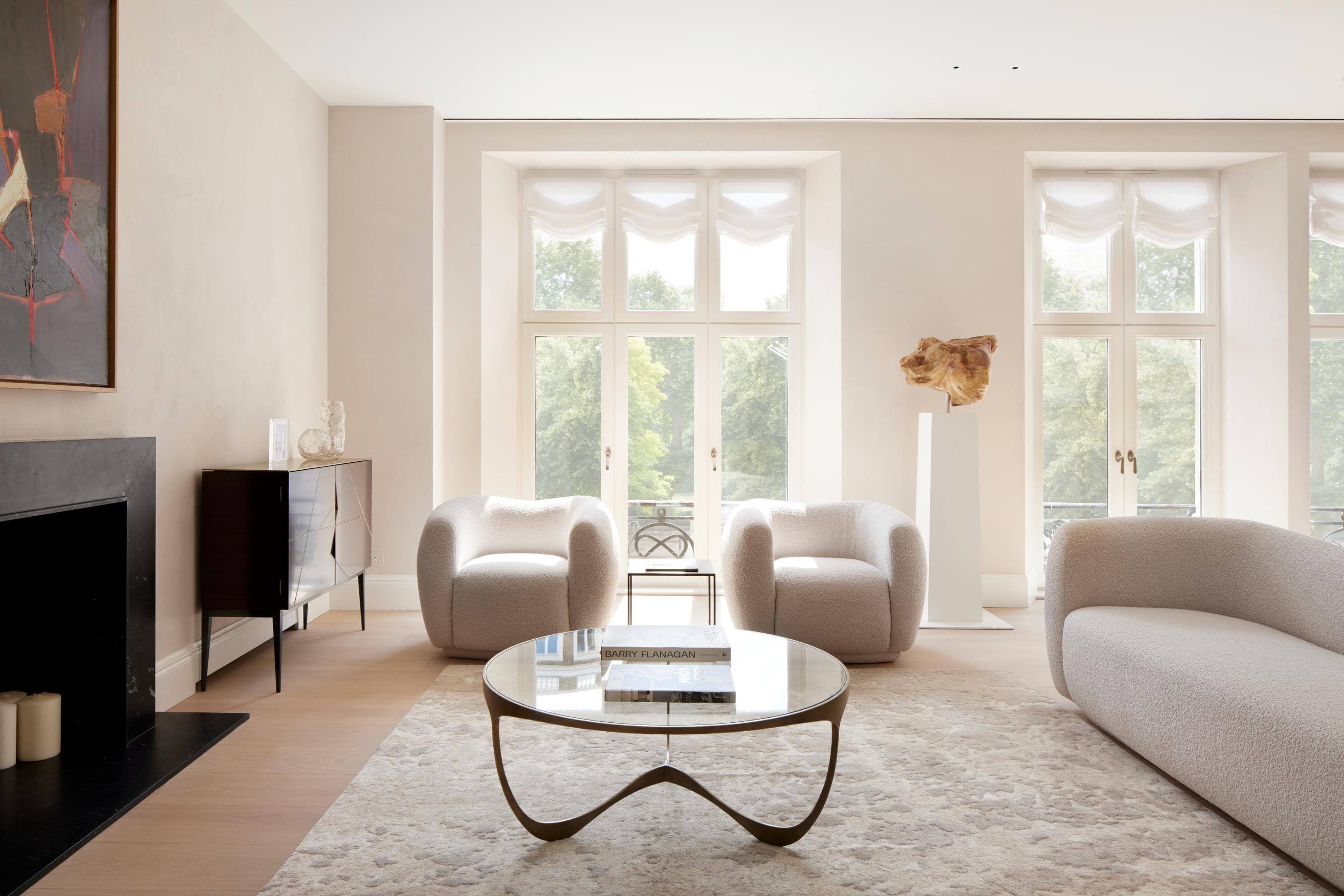 This split-level London apartment is a quiet, beautifully composed home where light, proportion and materiality set the tone. Soft natural finishes, warm textures and refined detailing create a calm backdrop for everyday living, while a sculptural curved staircase introduces a sense of movement. Generous living, dining and kitchen spaces flow seamlessly together, complemented by a gym, study and lounge on the lower level. Curated artworks punctuate the minimalist palette, forming a tranquil, timeless retreat attuned to its owners’ daily rhythms.