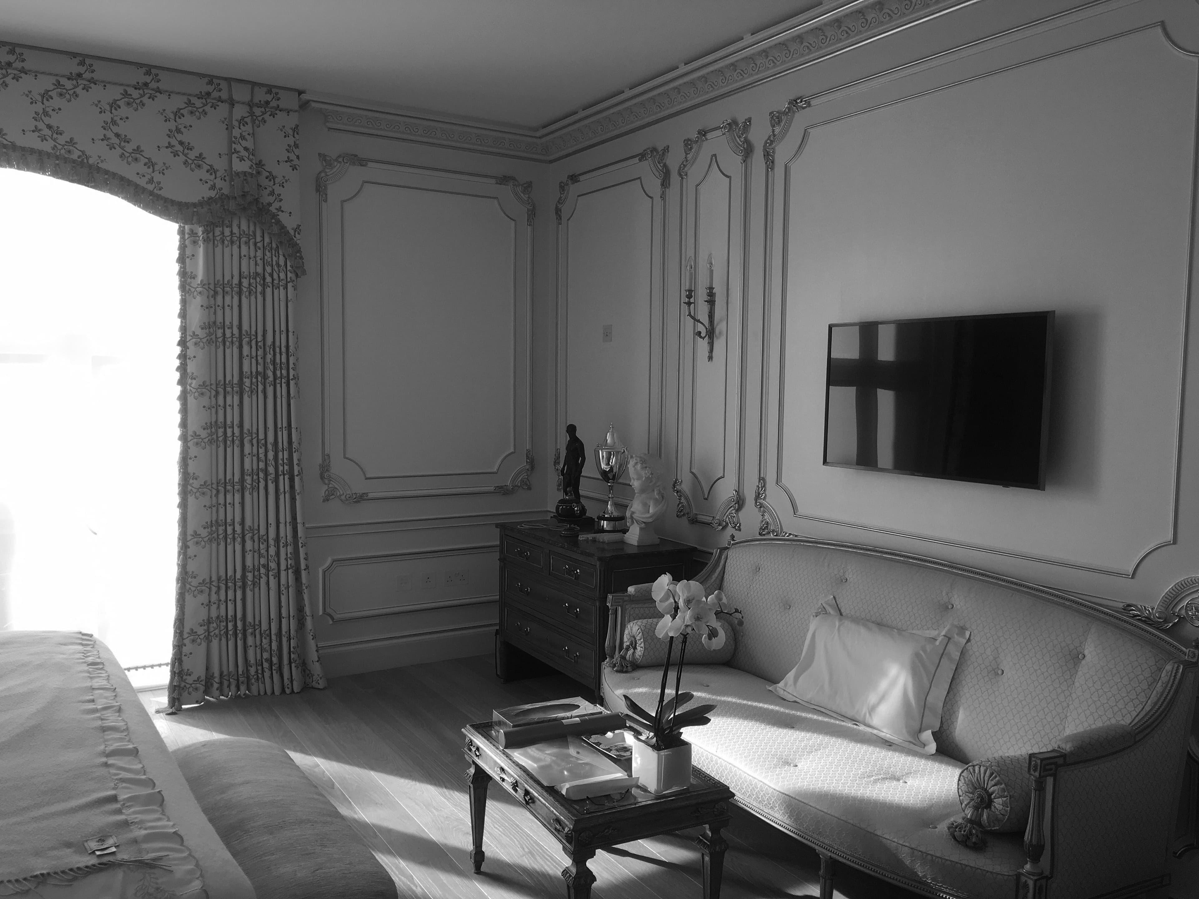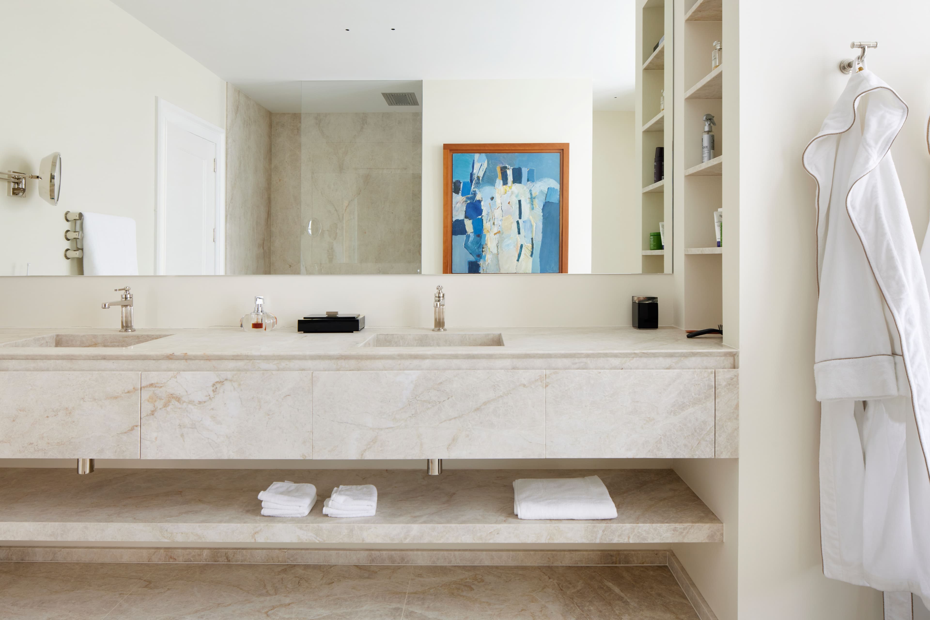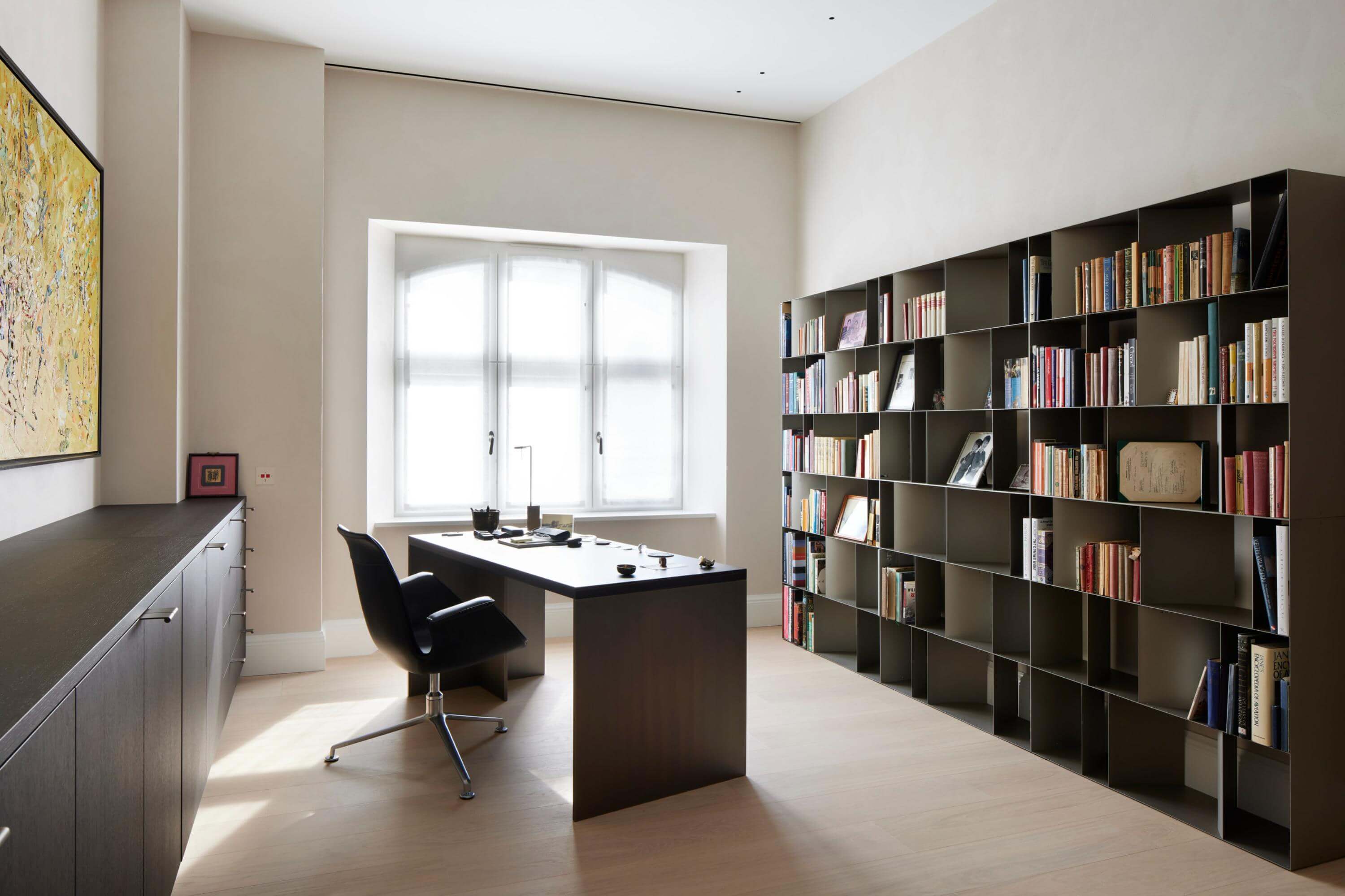 The owners – a married couple in their seventies – wanted a home that felt cohesive, generous and comfortable, supporting daily routines, focused work and entertainment. Previously arranged as multiple bedrooms and decorated in a highly ornate, richly coloured style, the apartment required reimagining to match their preference for soft tones, natural materials and minimalist furnishings, whilst complementing their beautiful art collection.