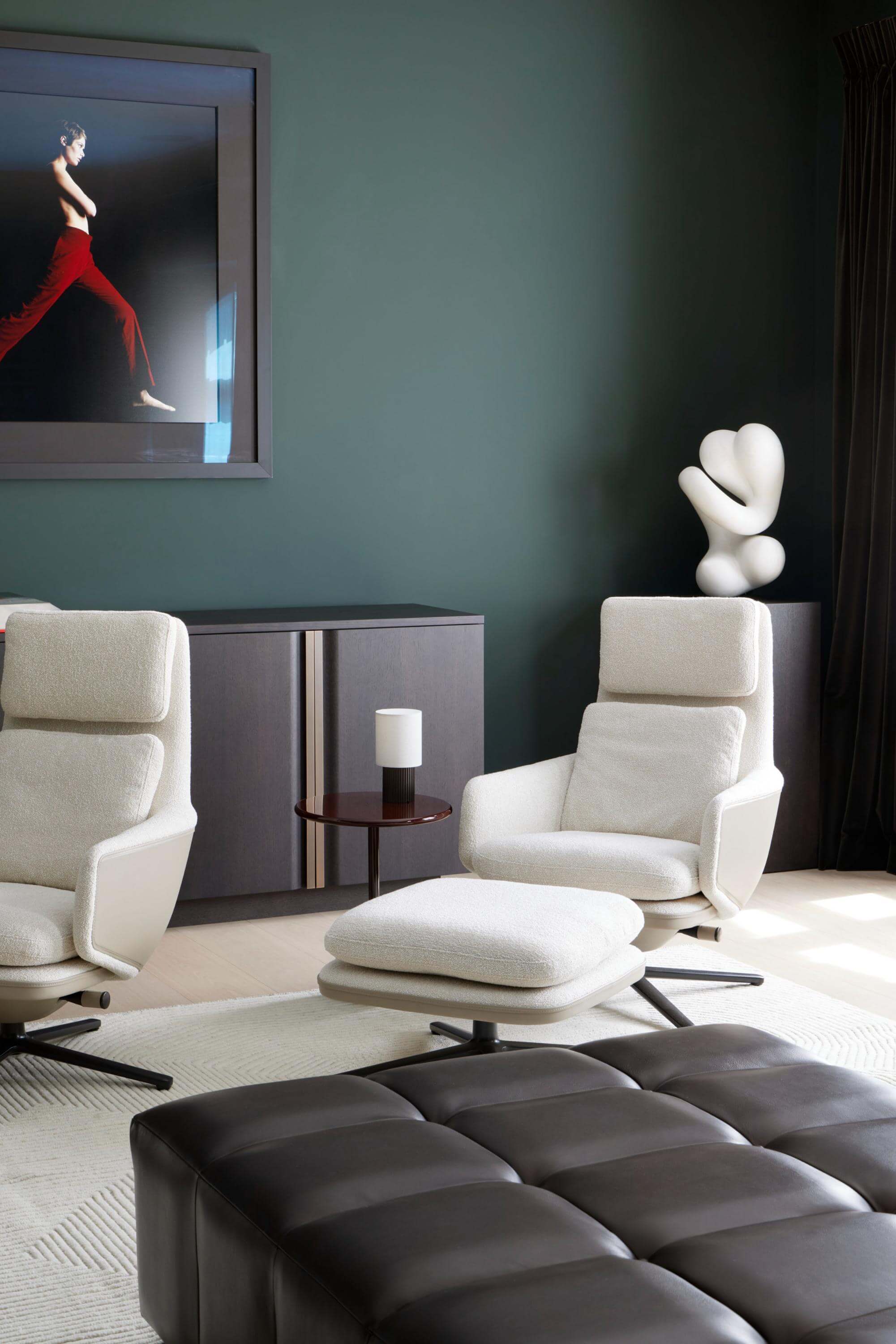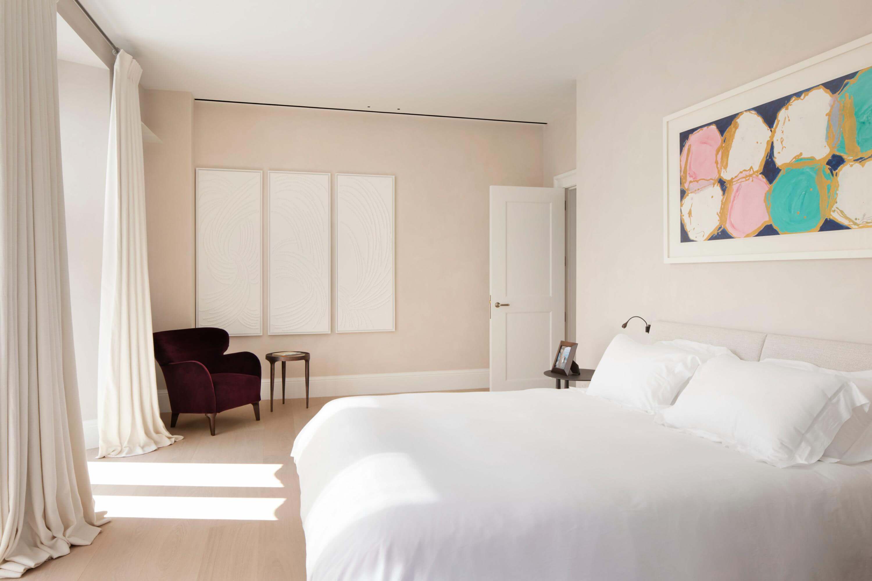 The curved staircase became the architectural centrepiece, linking both levels with gentle drama and reinforcing the home’s sculptural calm. Bespoke joinery and integrated lighting heighten the minimalist precision of each room, while tactile furnishings soften the interior without disturbing its clarity. A refined material palette replaces the previous decorative complexity with depth, texture and quiet warmth, complemented by curated artworks throughout. The completed apartment reflects a close, collaborative process – a harmonious, light-filled sanctuary shaped around the lives of its owners.