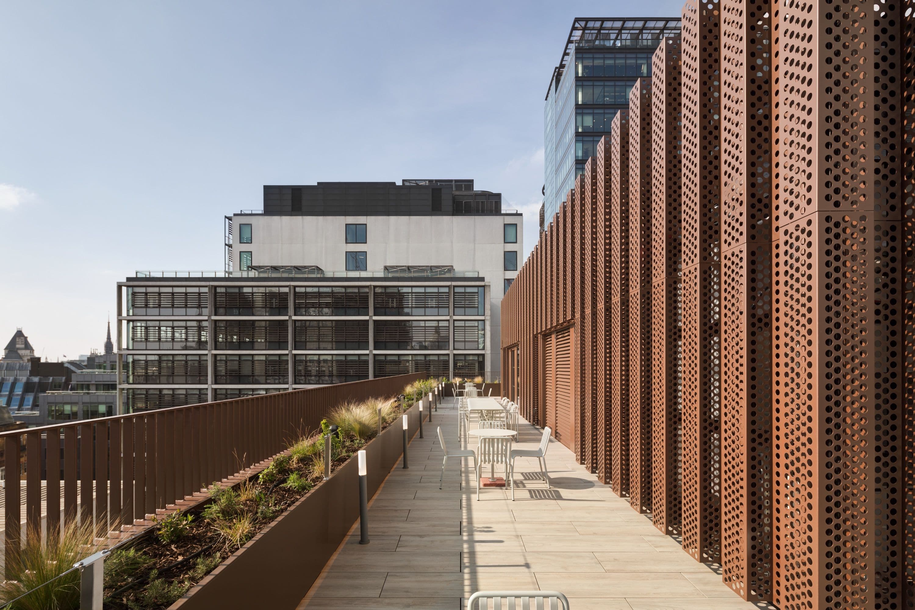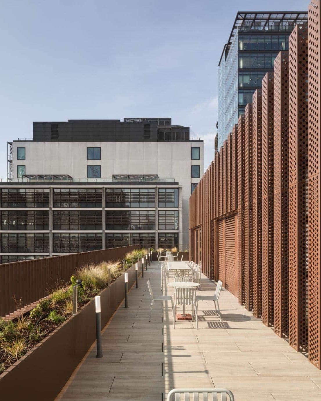 Working with the existing post-tensioned concrete frame, we introduced a transformative seventh storey: a rooftop pavilion and landscaped terrace carefully coordinated to sit lightly above the original structure. Its perforated metal architecture complements the existing fabric while opening the roof to daylight, views and events for over 150 people. Internally, floorplates were refined to maximise choice, allowing spaces to be reconfigured with minimal intervention as needs evolve.