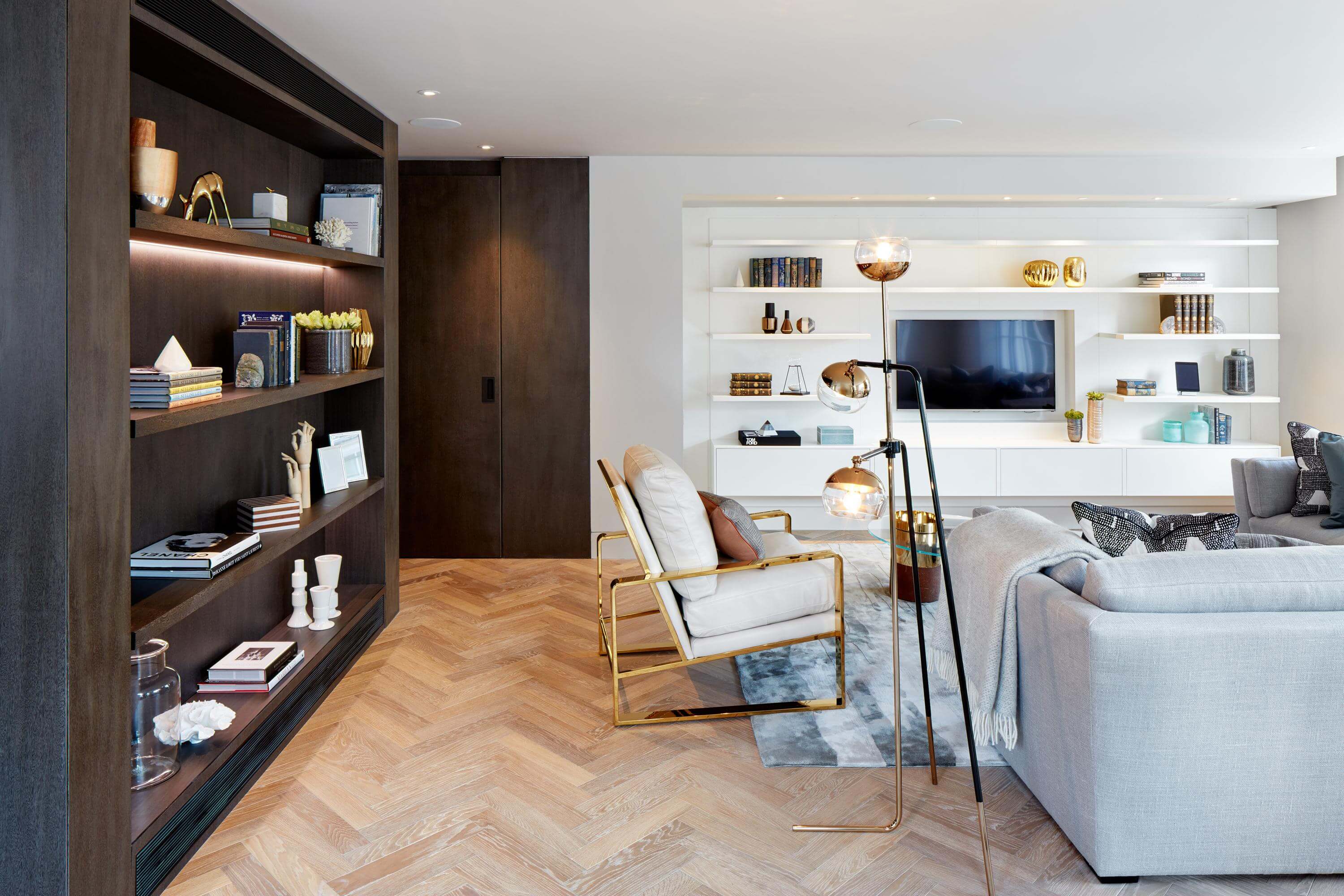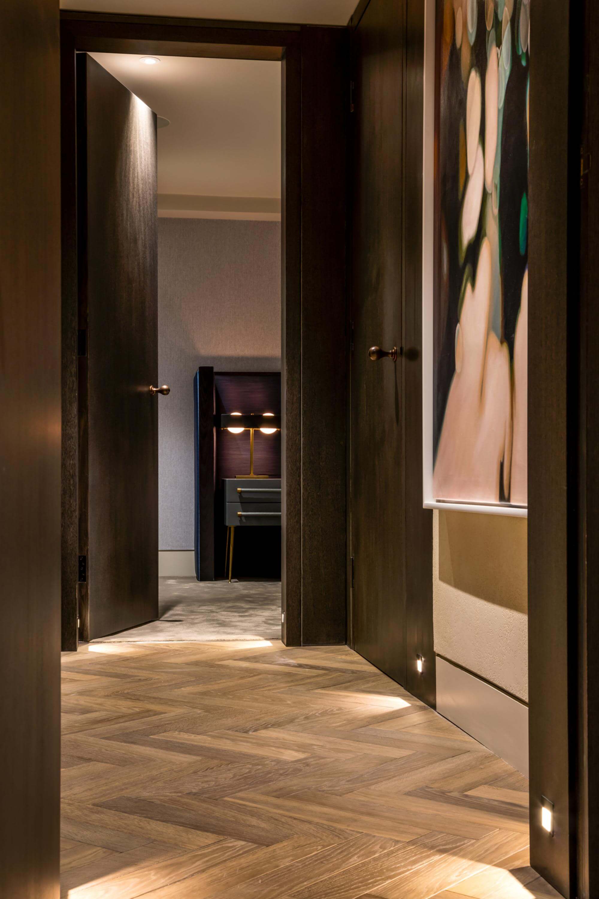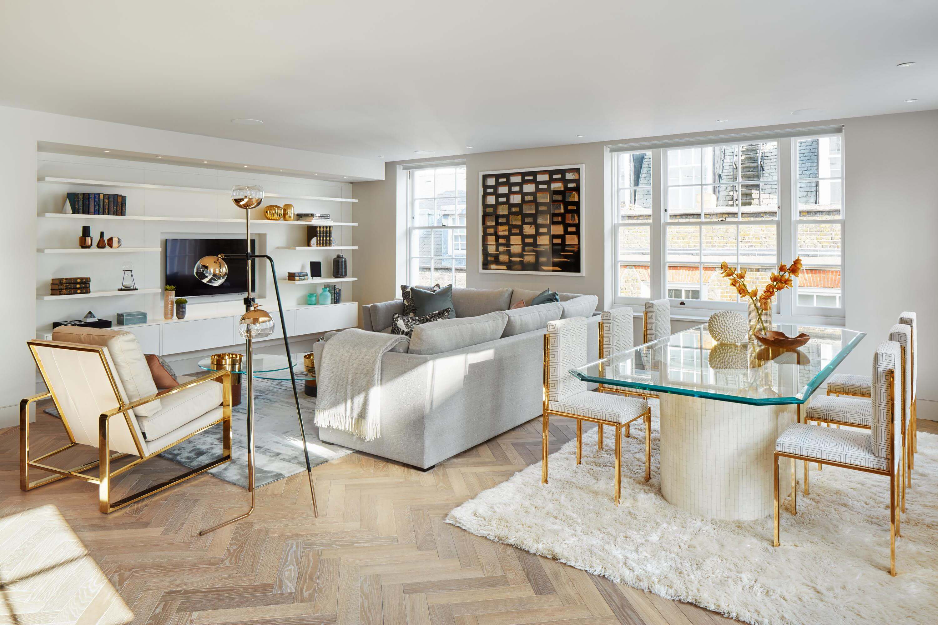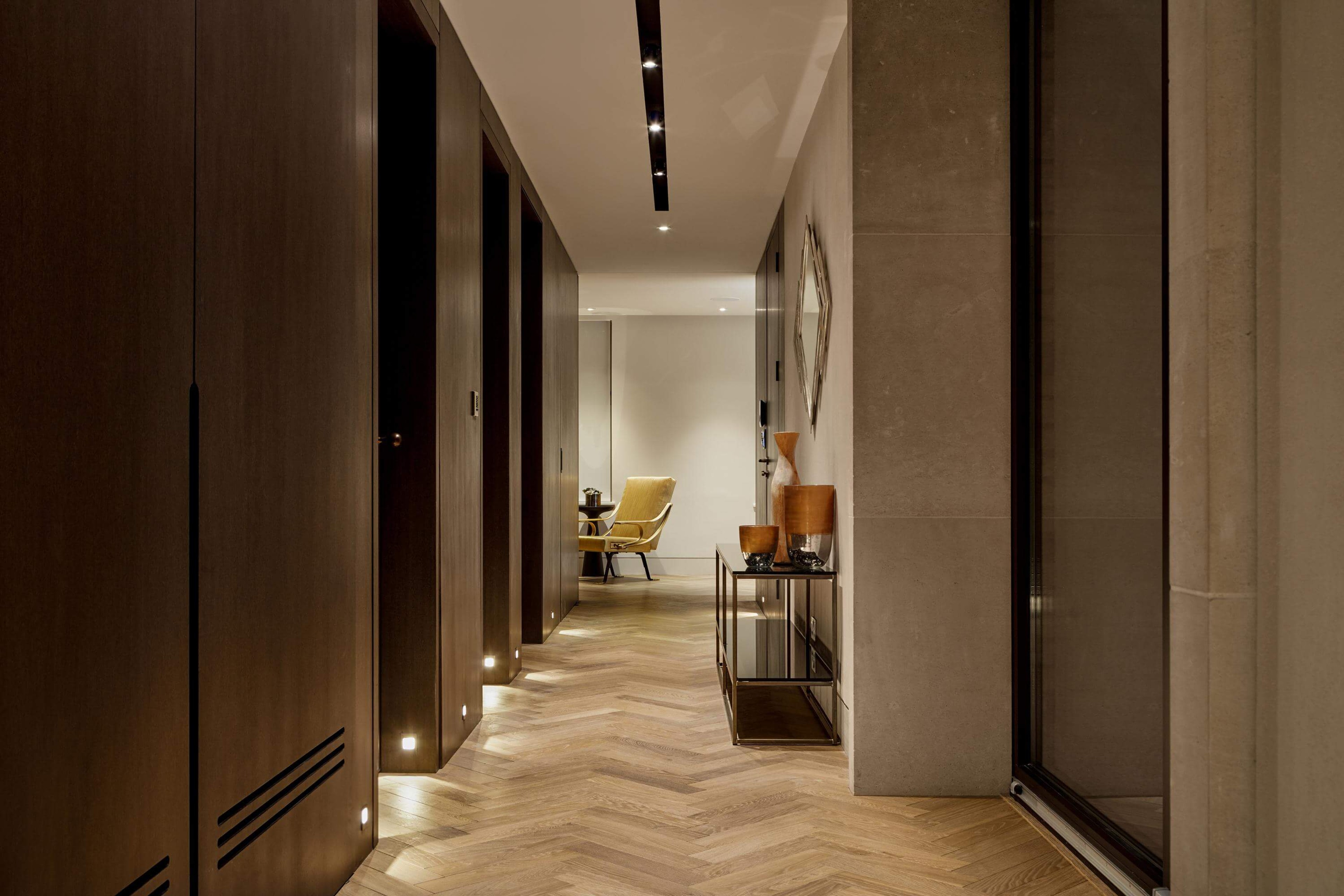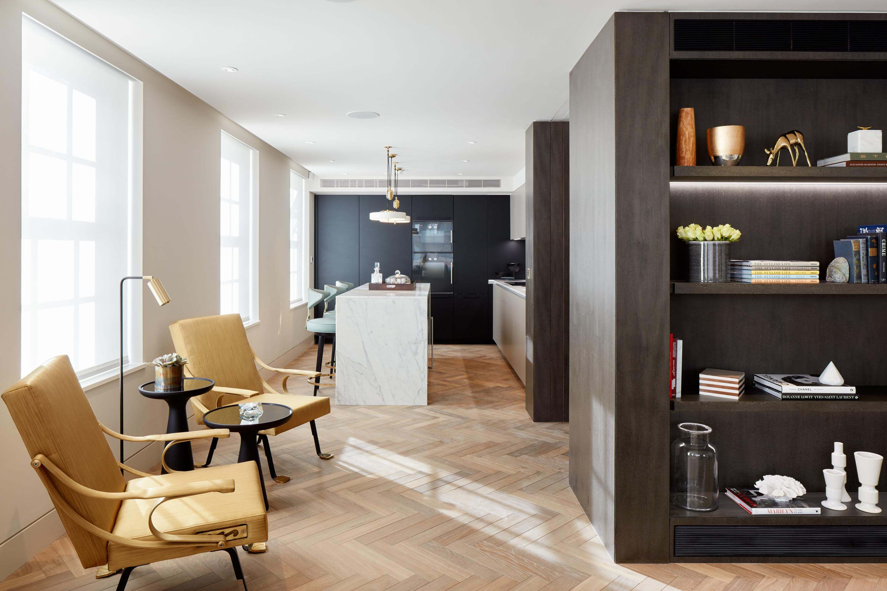 A palette of stone, timber and soft neutral shades create a sense of luxury on New Cavendish Street, one of Marylebone’s most coveted addresses. Two floors of contemporary workspace occupy the lower levels of the refurbished block, with three private apartments above – including one home set within a new mansard roof extension. Natural materials provide warmth and depth, whilst subtle gold accents add a quiet richness. The overall impression is one of understated elegance.