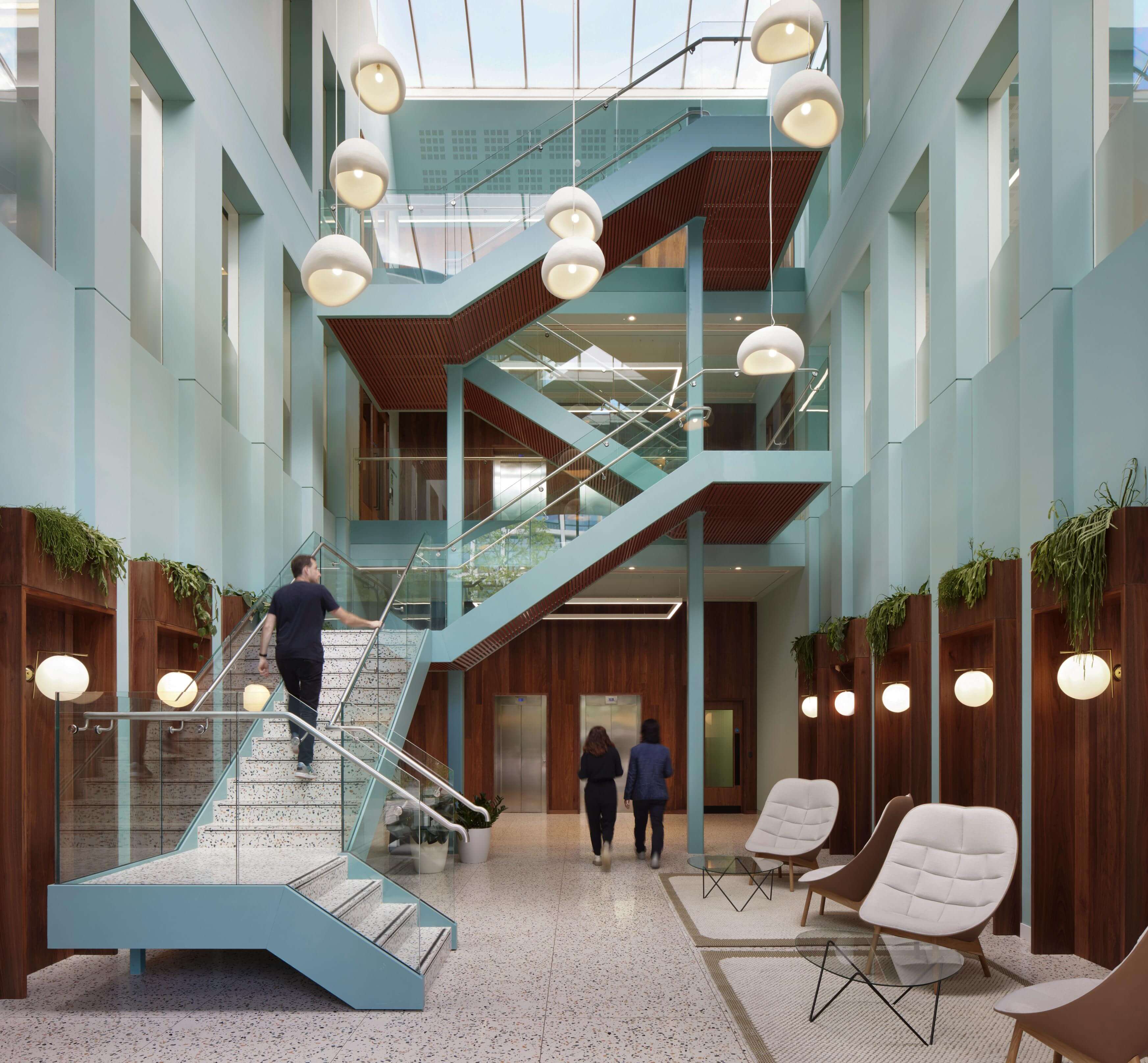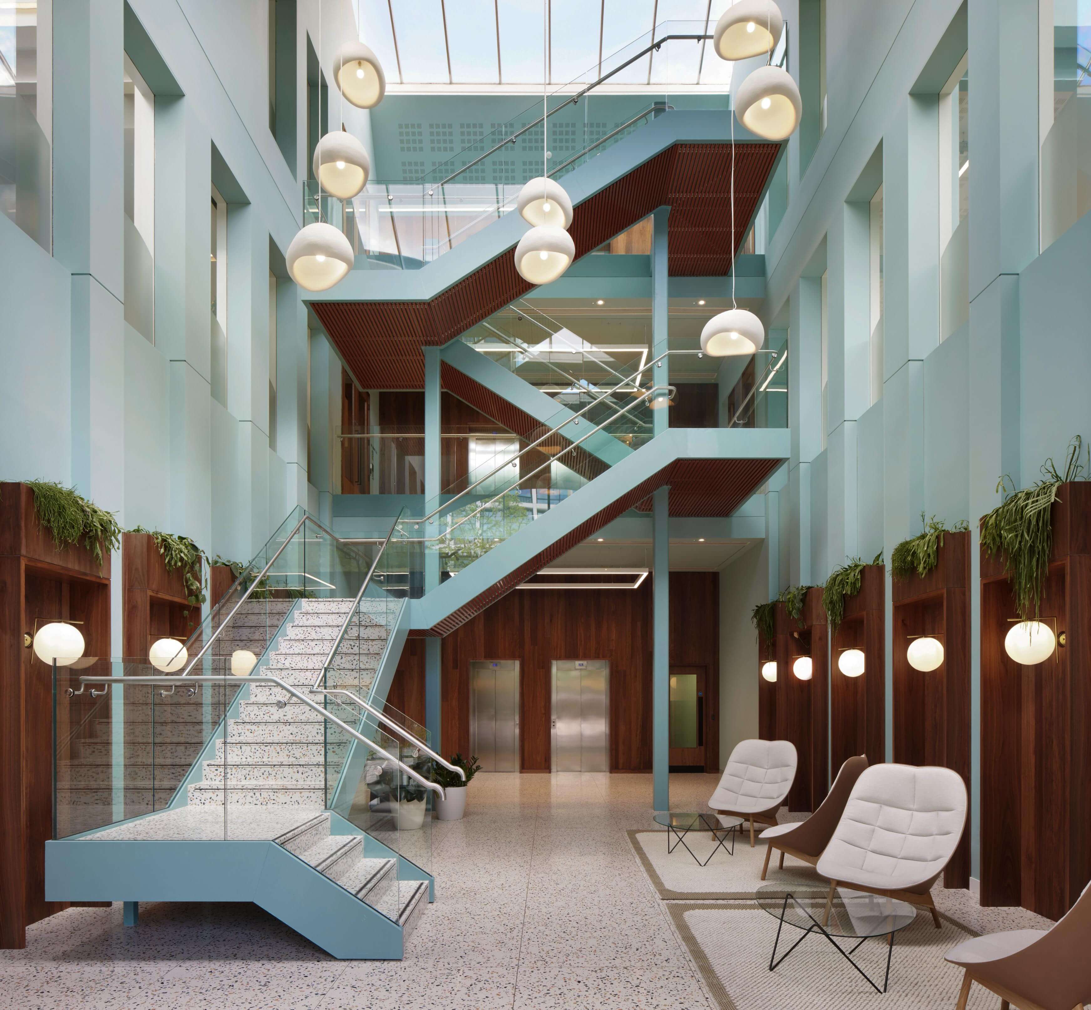 Our strategy focused on the reception and circulation route. The existing stair was visually striking, but it blocked views toward the lifts and compressed the sense of arrival. By rotating the lowest run by 90 degrees, the triple-height space opened up, creating clearer sightlines and a more intuitive route through the building. The intervention is minimal but transformative, allowing light, height and volume to be experienced more fully.