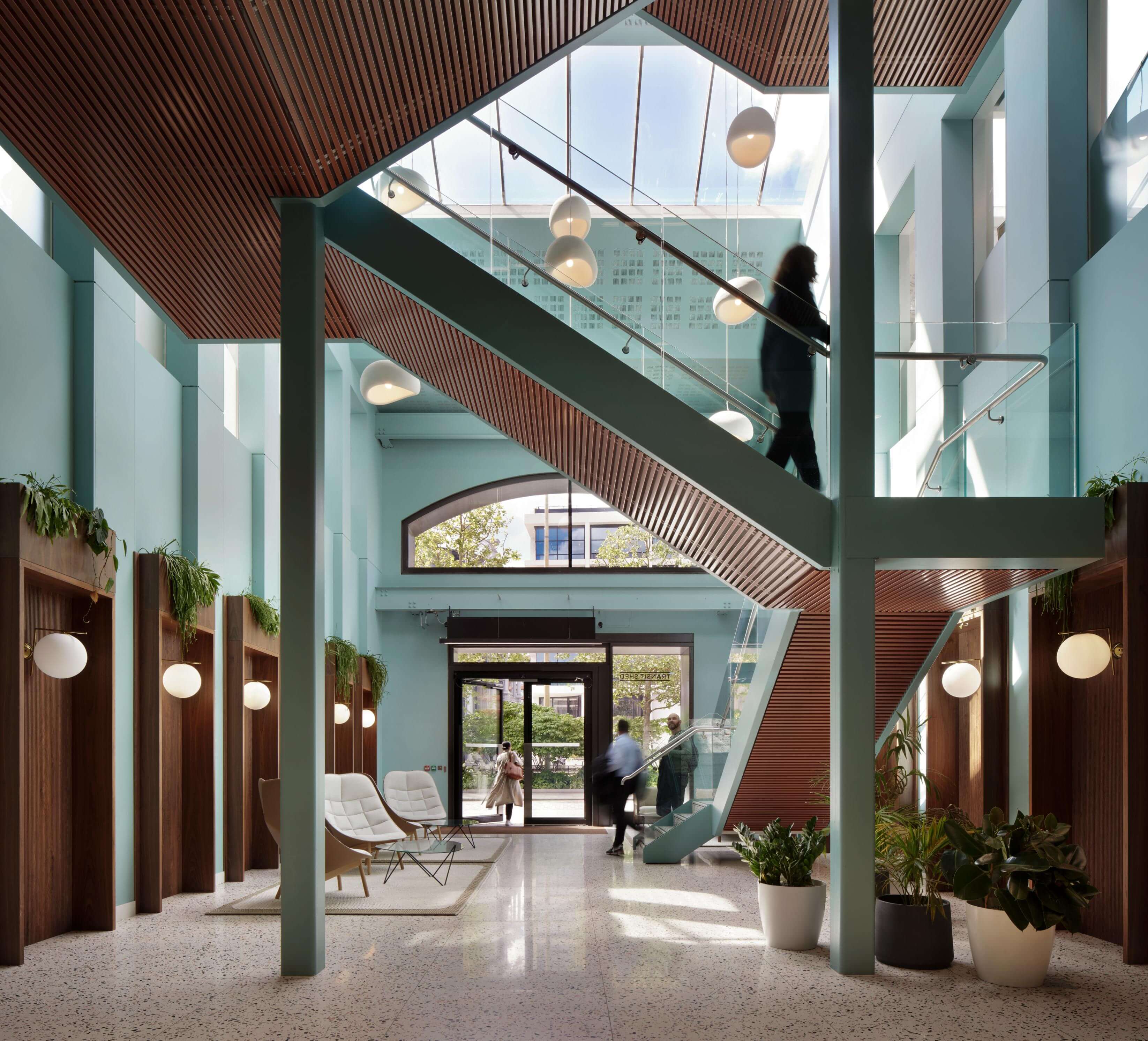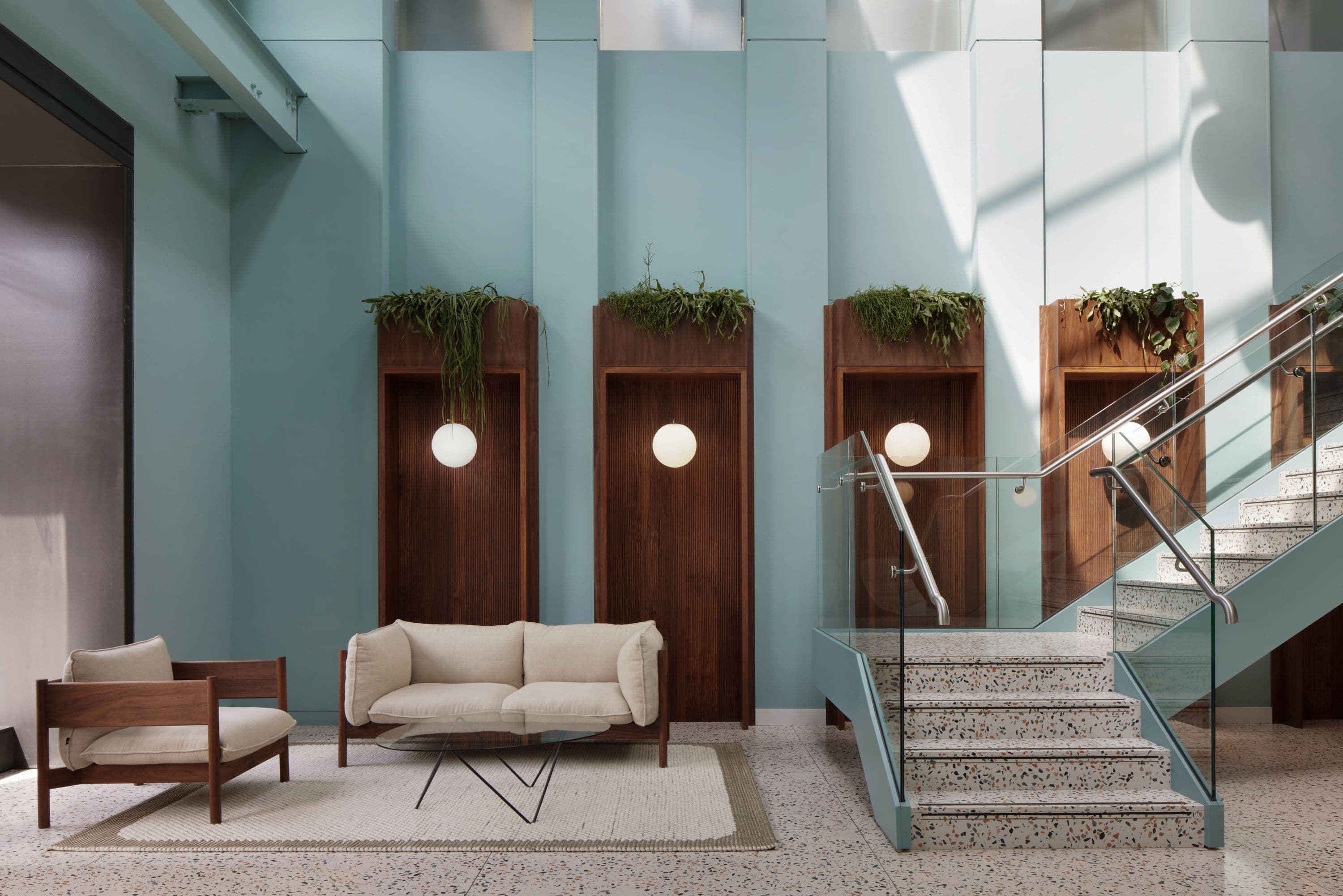 Flexibility shaped the next set of decisions. Removing the oversized reception desk freed space for softer furnishings, breakout seating and spots suited to short meetings or calls. Materials were carefully simplified: timber, terrazzo and gentle blue tones tie the scheme together without feeling decorative. Each move is deliberate and economical, helping the building feel warmer, more adaptable and better aligned with contemporary ways of working.