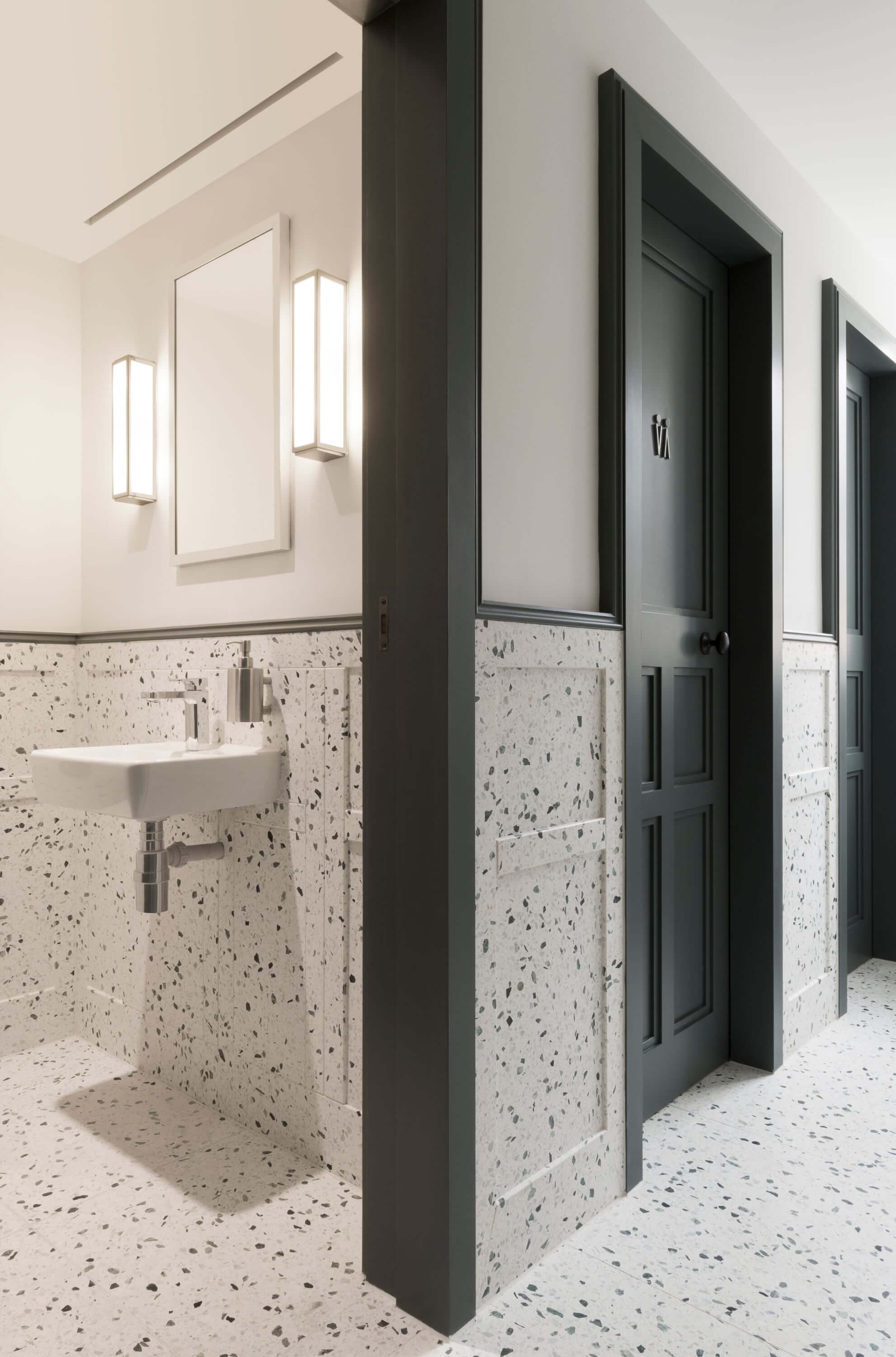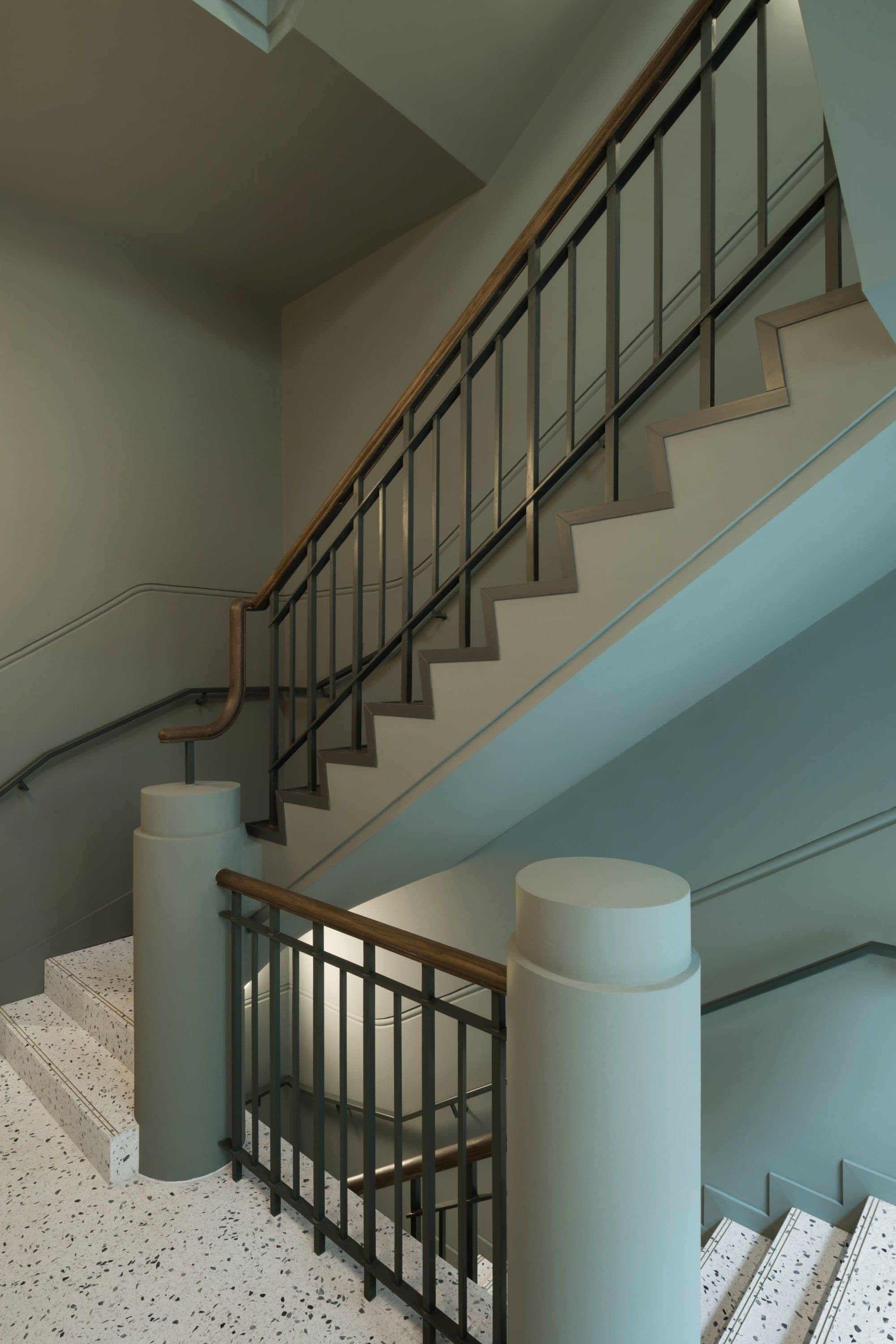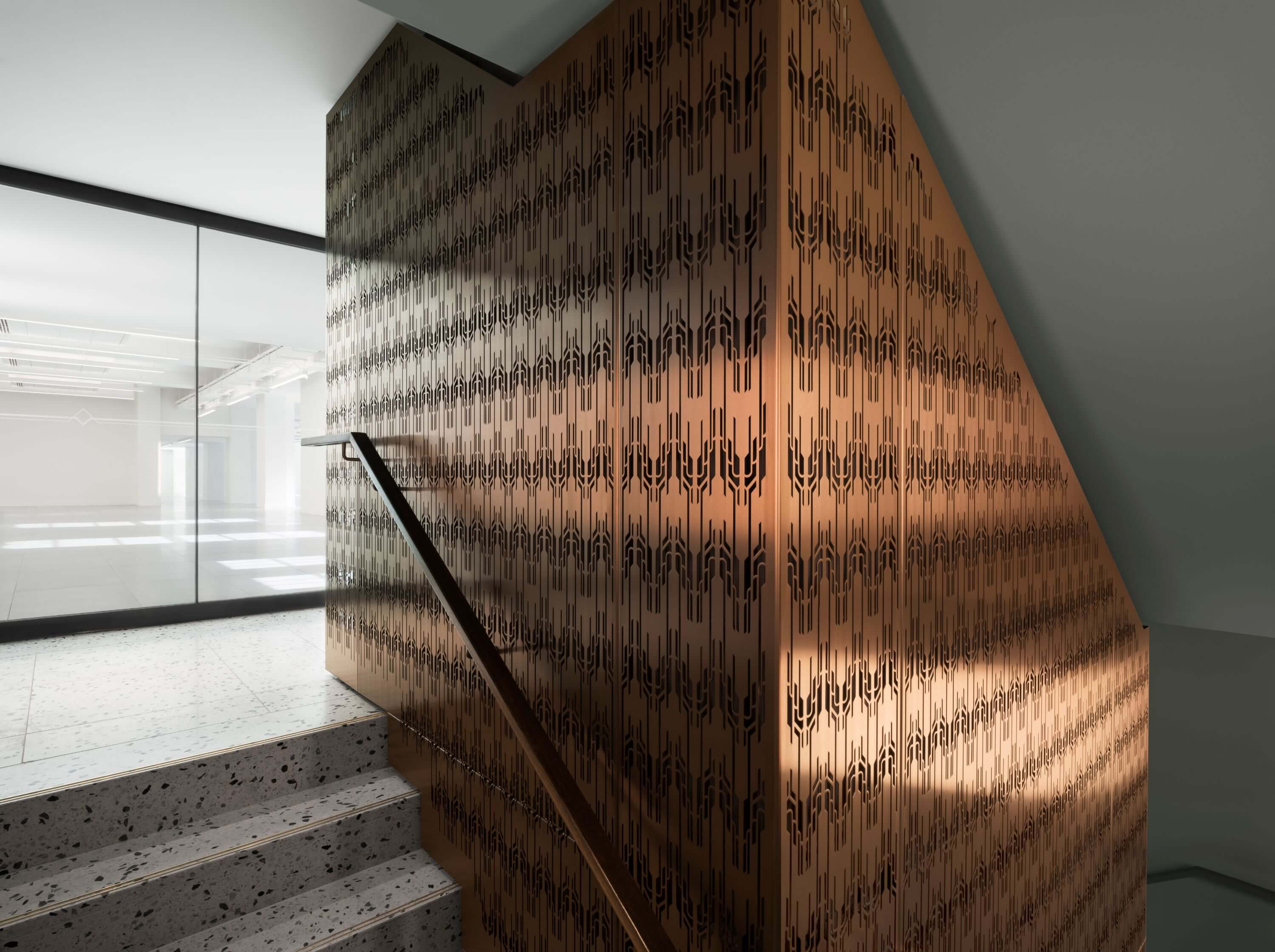 The building has been fundamentally rearranged for multiple uses. Three new entrances serve a restaurant, gym and workspaces; windows have been enlarged to rebalance the façade; and brickwork and decorative metalwork have been carefully restored. Inside, Bureau de Change’s crafted interventions define the experience – from the bronze-coloured filigree mesh that wraps the core, to bespoke terrazzo panels, bronze wayfinding, reinstated joinery and precisely organised services that complement the existing structural grid. The result is calm, adaptable workspace that celebrates structure, heritage and making.