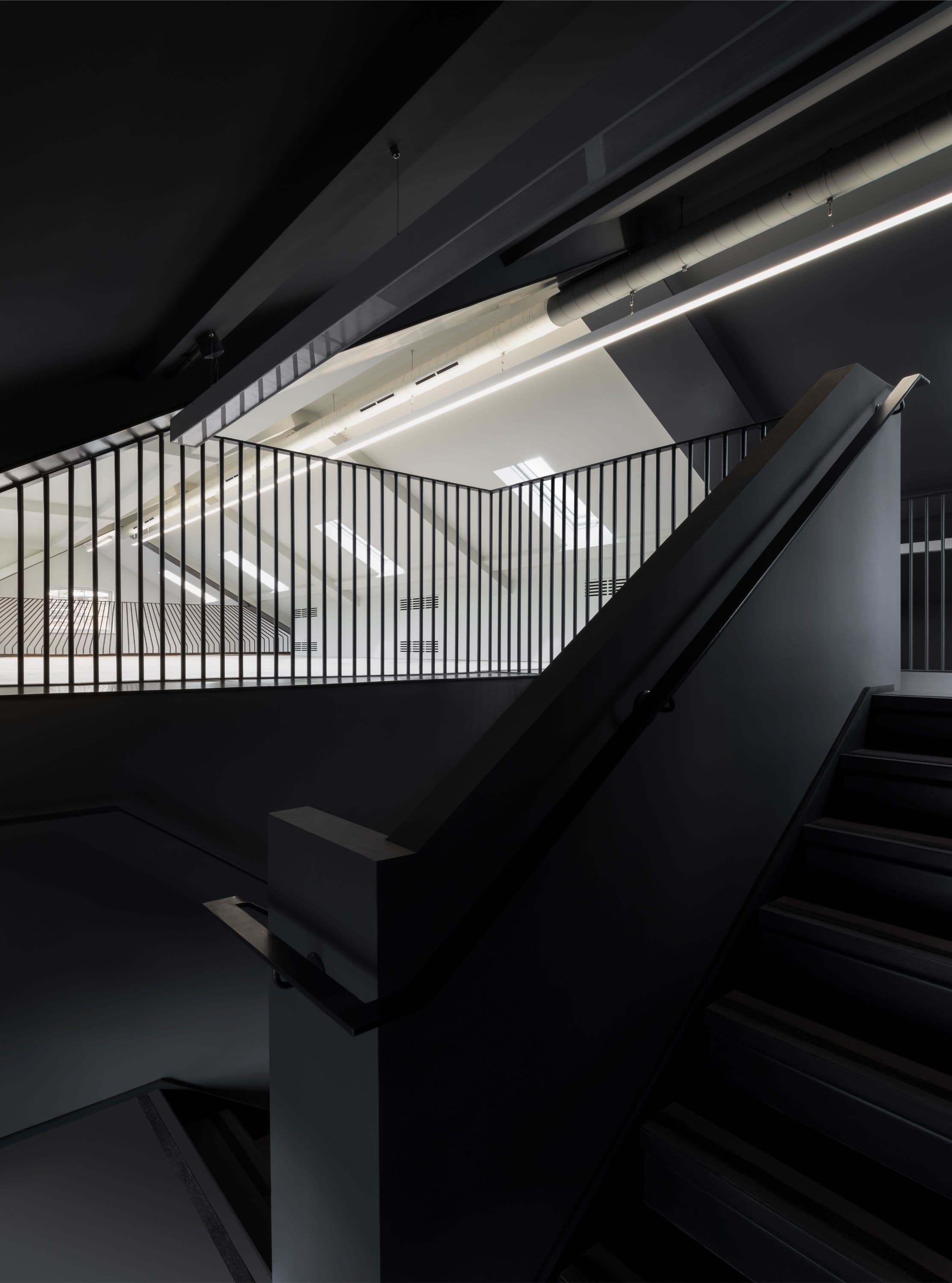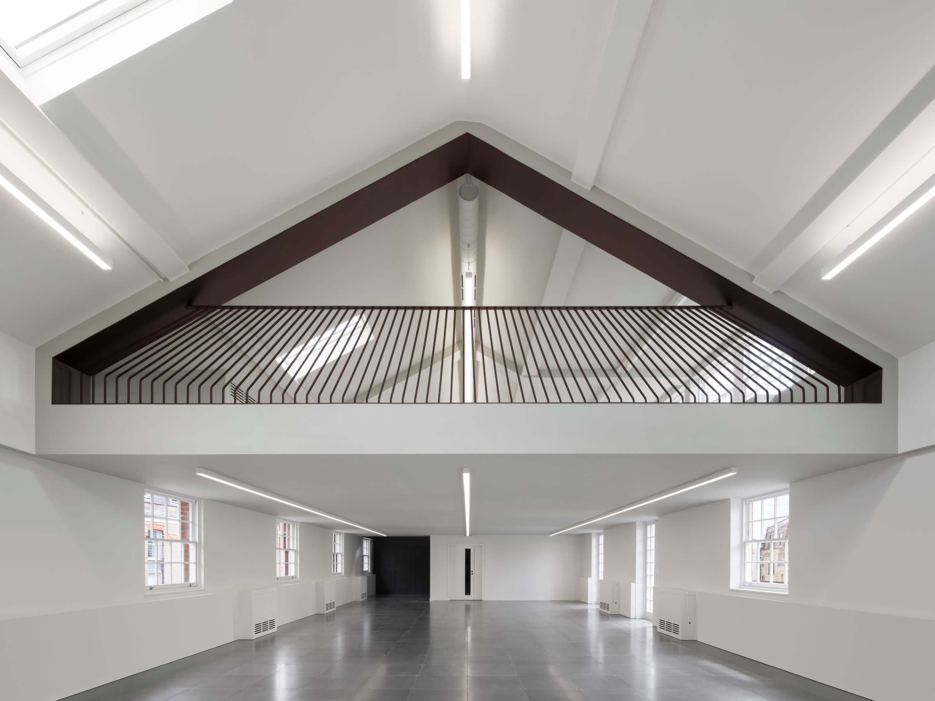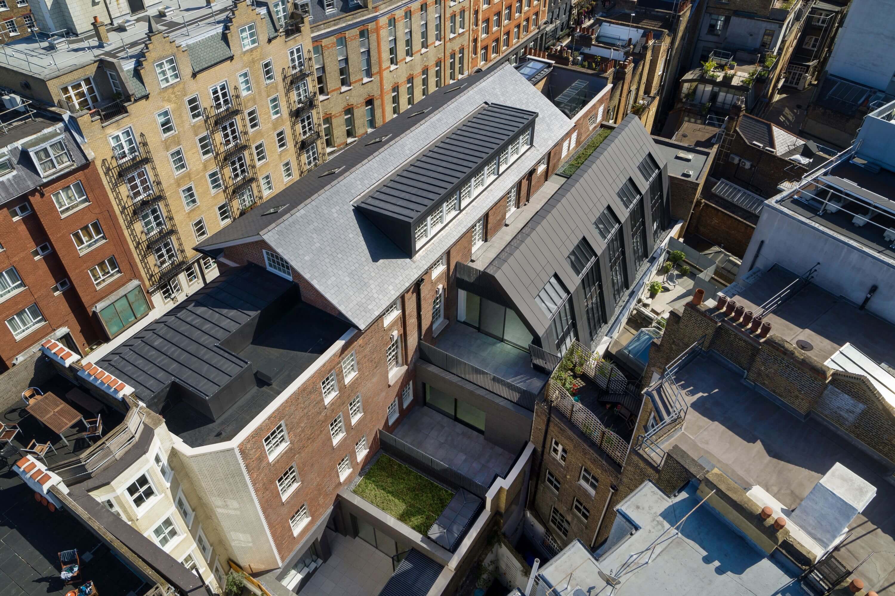 We refurbished, reconfigured and extended the original structure, carefully stitching old and new together. To the rear, our extension arcs back toward the upper roof, its faceted, pre-patinated zinc roof inspired by artists’ studio glazing. The addition doubles the building’s depth, flooding spaces with light and creating distinctive internal volumes, while stepped terraces look down onto a planted, terrazzo-lined garden. Two new rooftop pavilions bookend the façade, introducing high-domed studio spaces with expansive views across Fitzrovia.